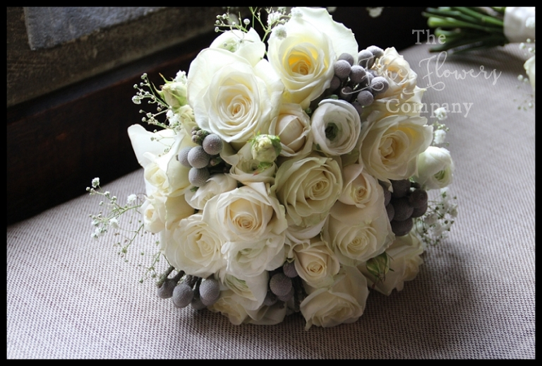 Vicky, her bridesmaids and cute flowers girls all carried very pretty wintry bouquets of white roses, spray roses, ranunculus and gypsophila with accent silvery grey brunnia berries to link in with their beautiful lilacey grey dresses. Jason and his groomsmen wore matching buttonholes of white roses and silver brunnia berries.