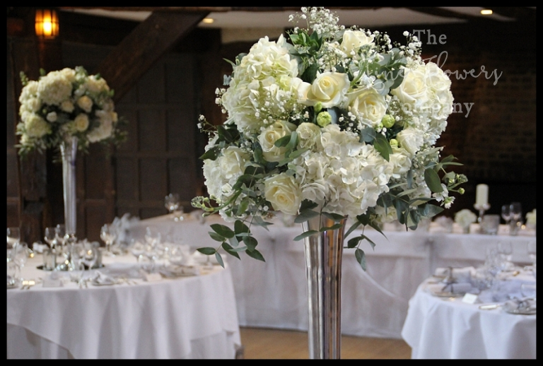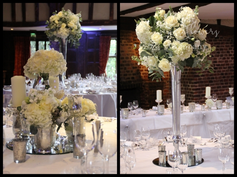 The single-minded silver and white monochrome theme carried on throughout the venue flowers and centrepieces too, with tall silver vase centrepieces of roses, hydrangeas, gypsophila and lisianthus being used to dress the ceremony room, and then afterwards, the central guest tables in the Tithe Barn. Under the eaves, the few tables here were dressed with clusters of silver vase centerpieces with our tall stemmed votives and pillar candle holders, with extra votives and interesting layering of pearls within the central vases.