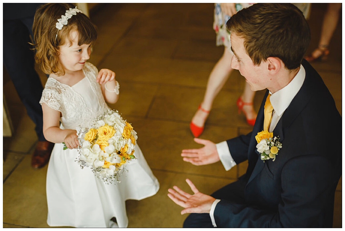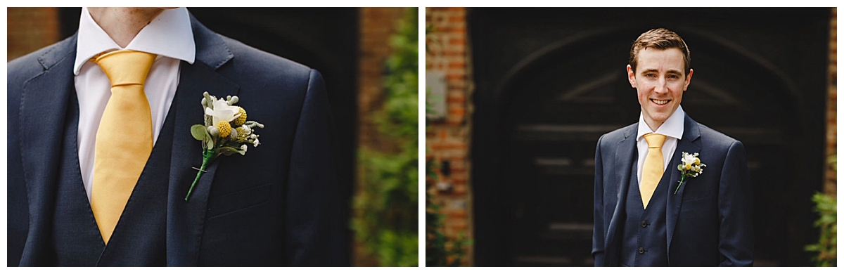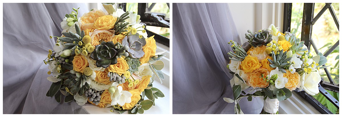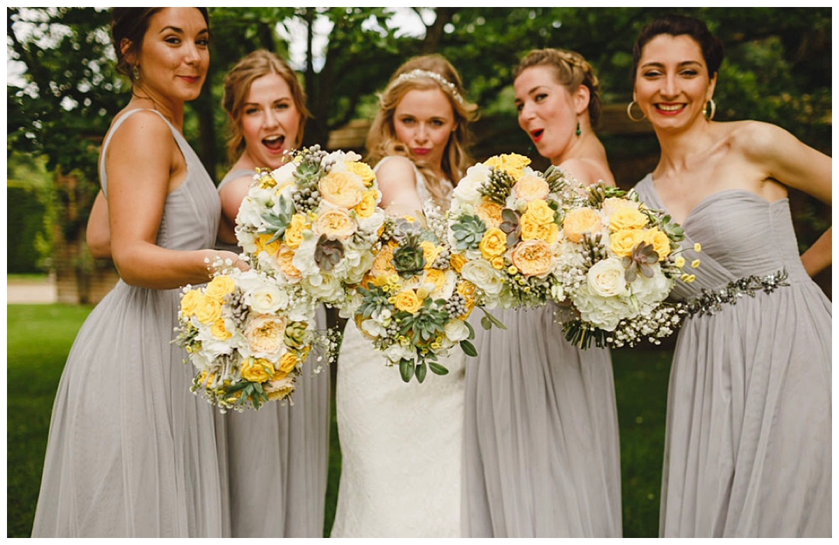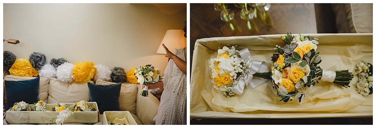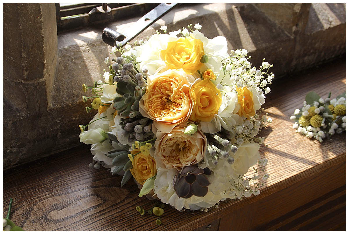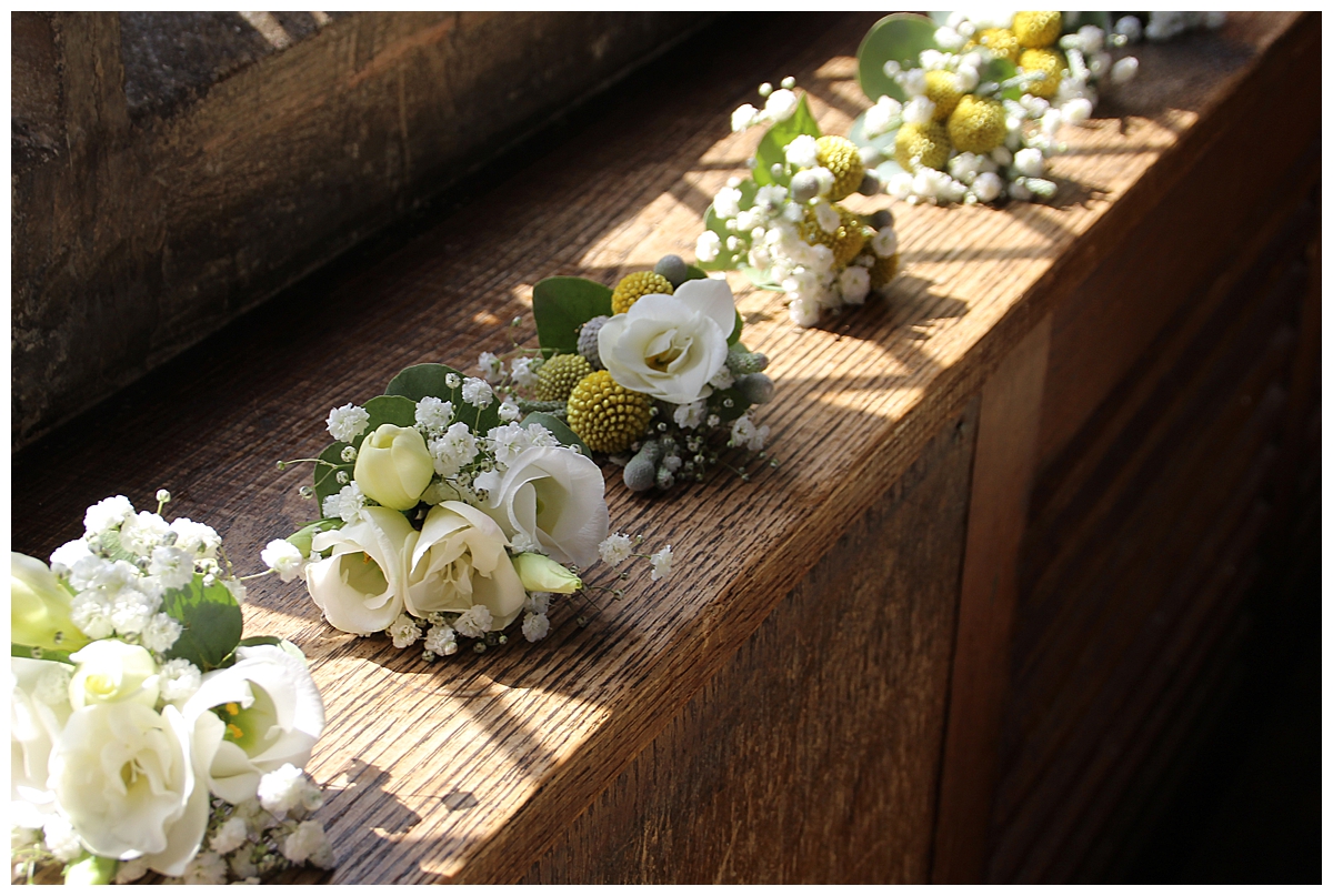 Hannah and her bridesmaids carried gorgeous and textural bouquets in a summery mix of ivory, golden yellow, and silvery grey, while Mathew and the wedding party men sported elegant buttonholes of craspedia, gypsophila and eucalyptus sprigs, and was pleased to see that these were a perfect match not only for the smart ties, but also the men’s playfully yellow socks. The mix of Golden Vuvuzela garden roses, ivory roses, scented freesias, hydrangeas, yellow craspedia and daisies, and silver brunia berries & succulents, looked amazing in the bouquets and stood out beautifully against the silver grey bridesmaids dresses. Meanwhile, the mums corsages used freesias, lisianthus and gypsophila. Such a pretty effect!
