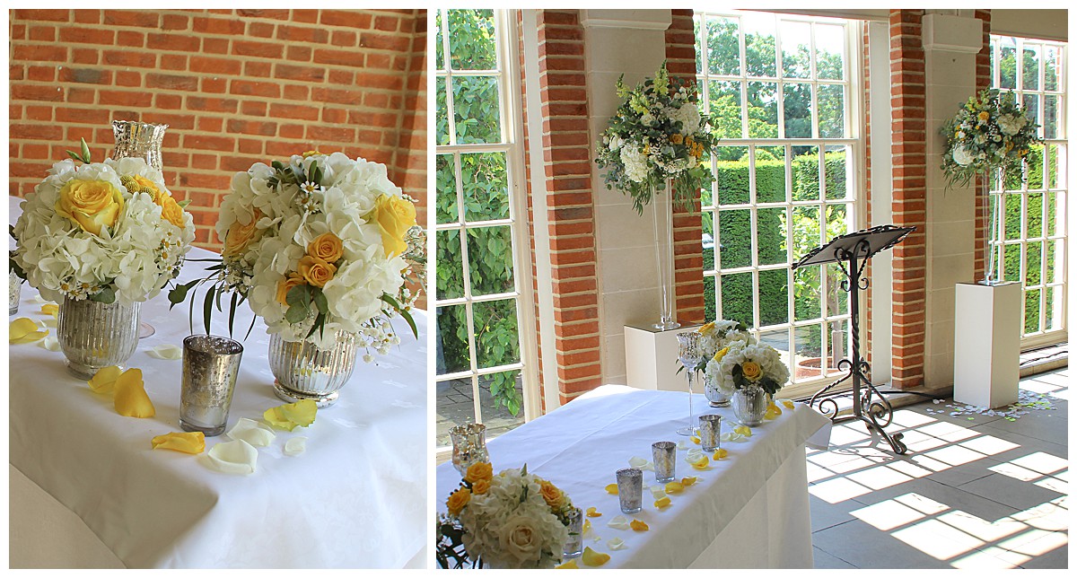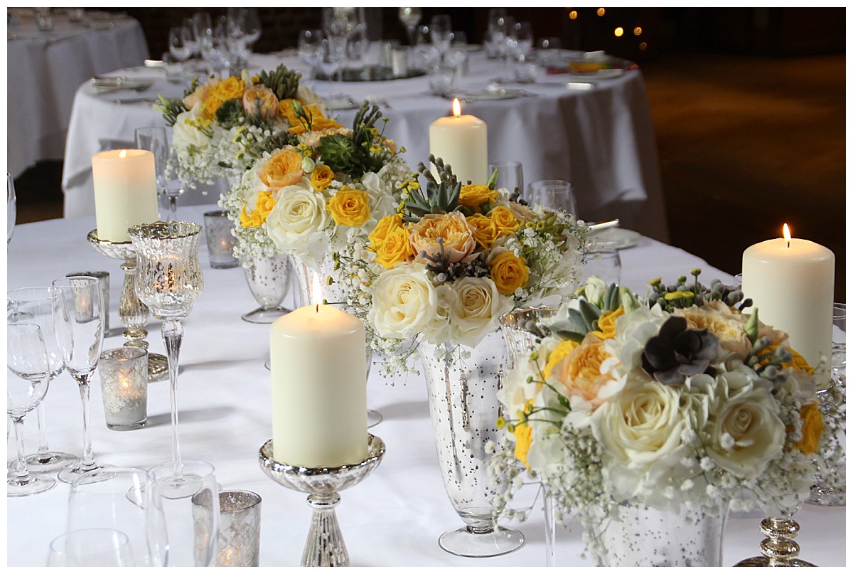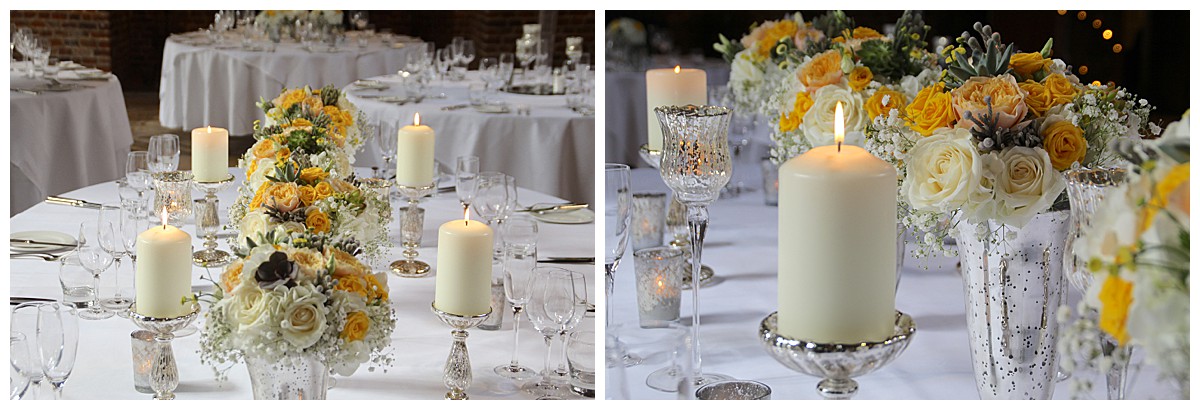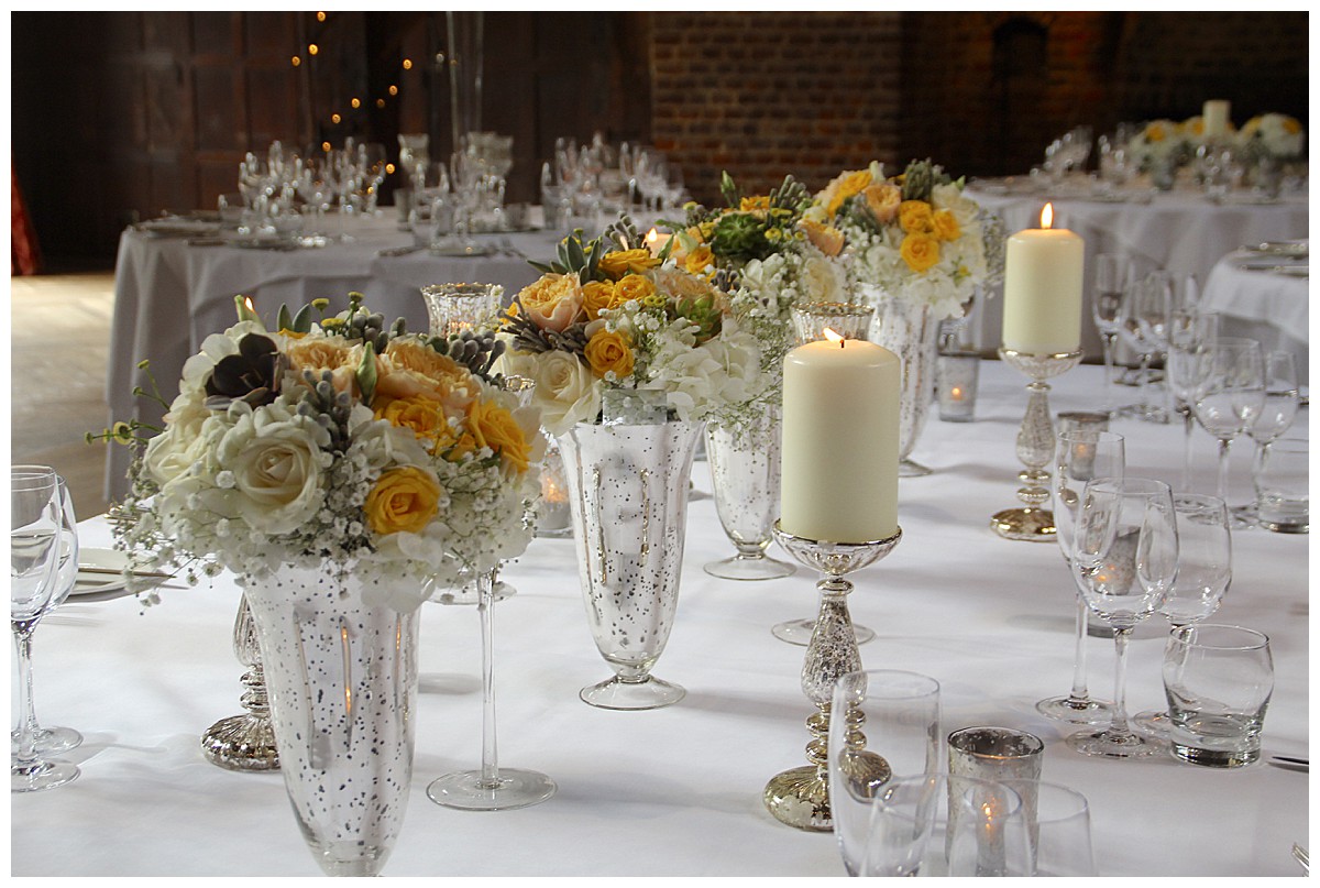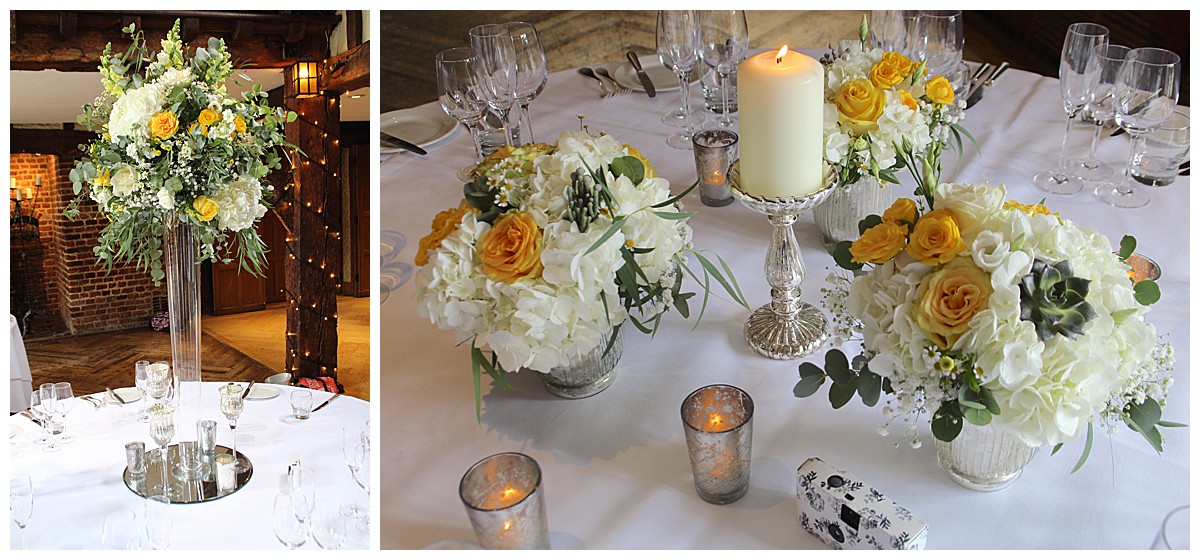 Hannah and Mathew’s golden yellow themed wedding at Great Fosters Hotel in Surrey was a really happy summer celebration featuring a beautiful mix of ivory and summery yellow wedding flowers with a rustic yet elegant style. The couple chose some of our beautiful vintage silver mercury glass props, to contrast with the golden yellows and add a touch of glam for their table decor.