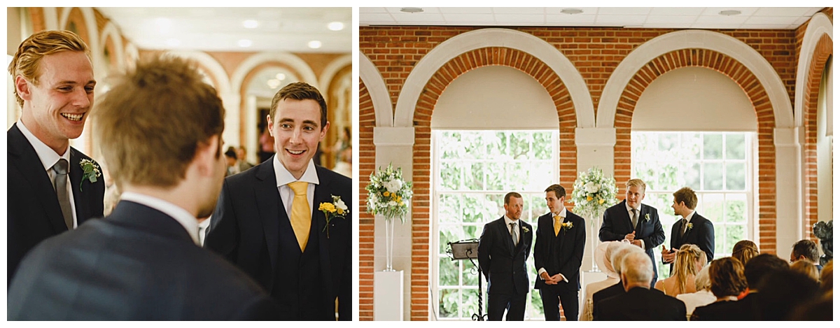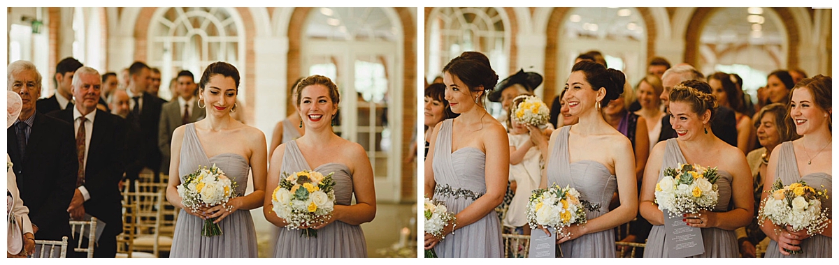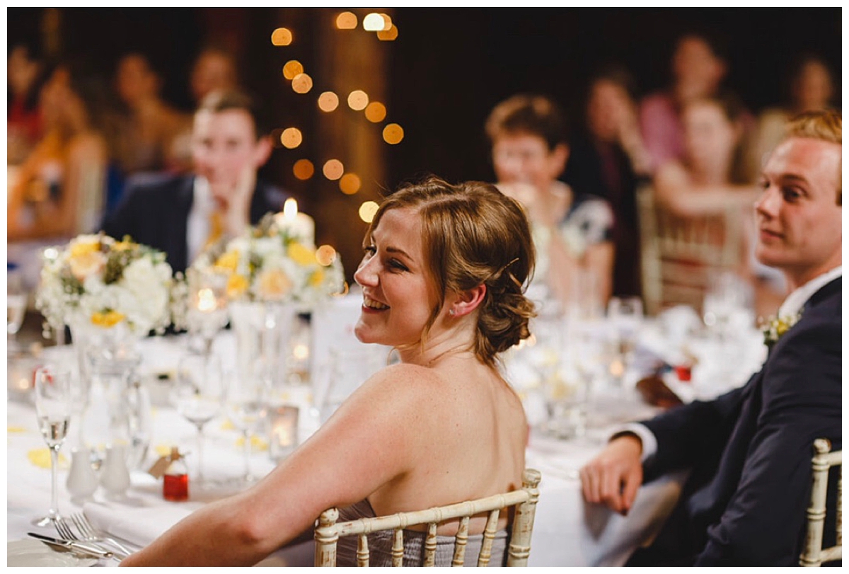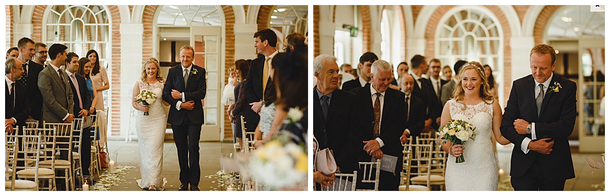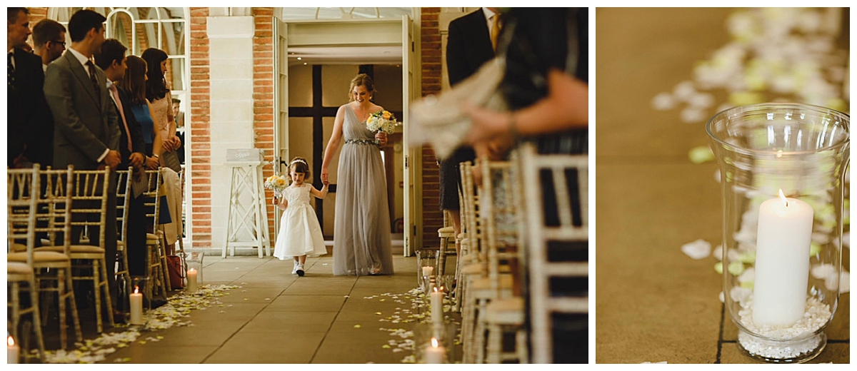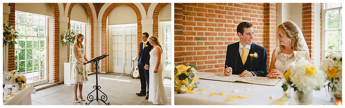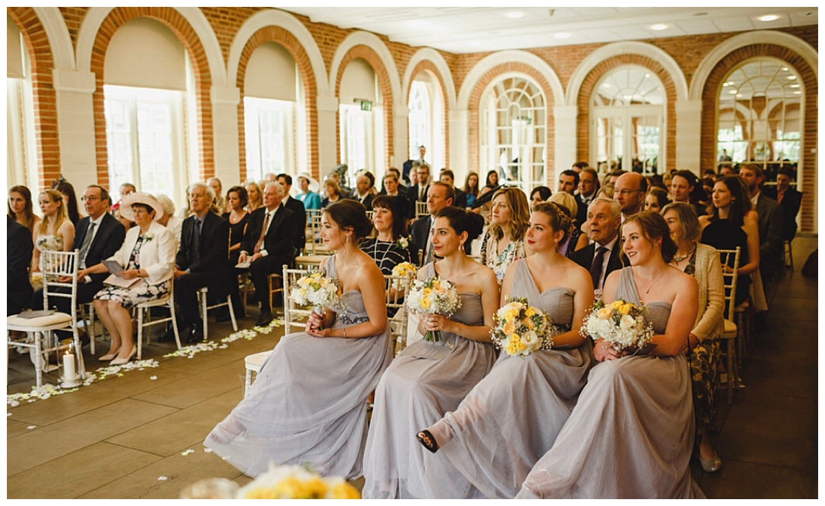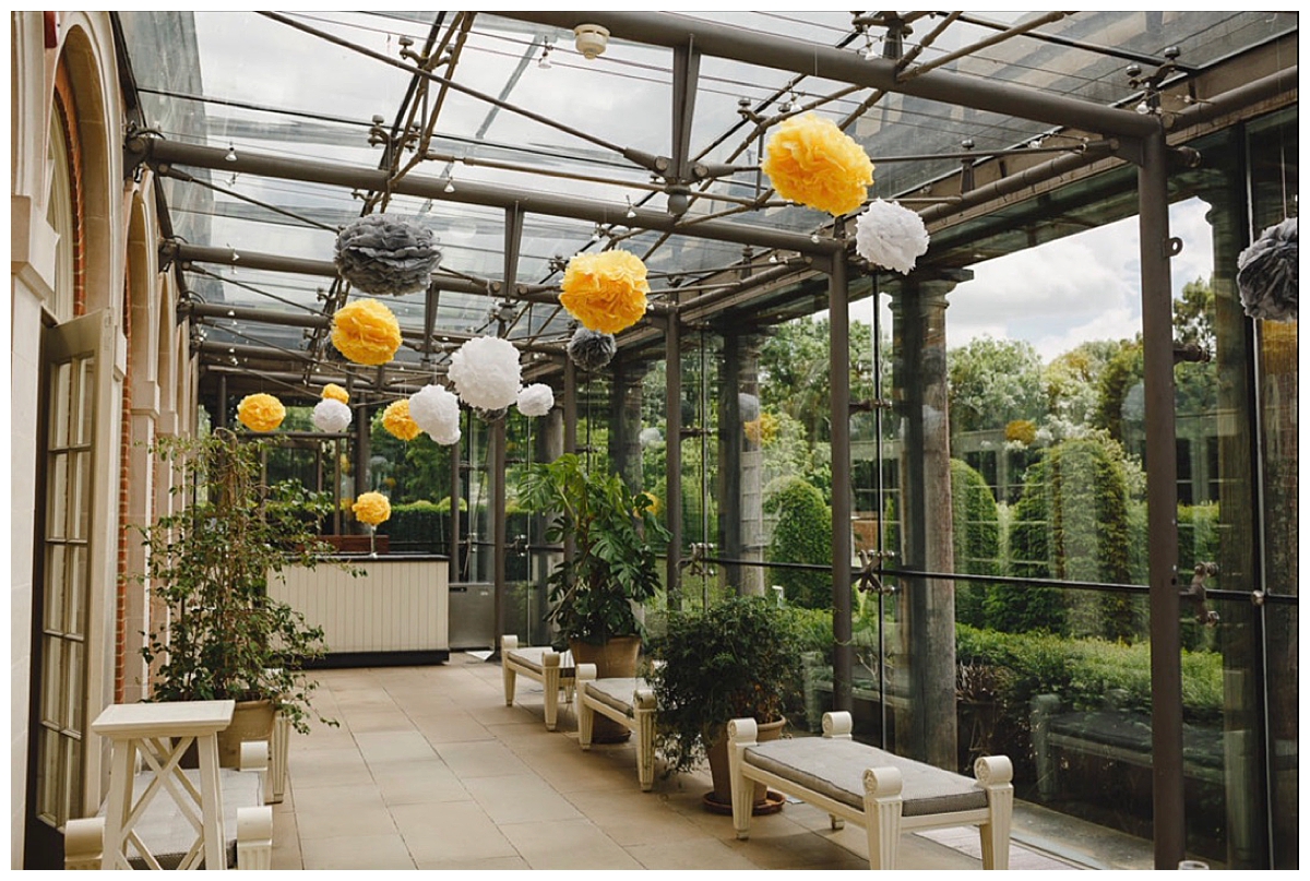 The ceremony in the light and airy Orangery was adorned with beautiful flower arrangements and candle-lit storm vases, creating a romantic ambiance. Next door, in the conservatory, Hannah & Matt hung cute paper lanterns in golden colours, perfect for drinks and canapés and later on for chilling out during dancing.