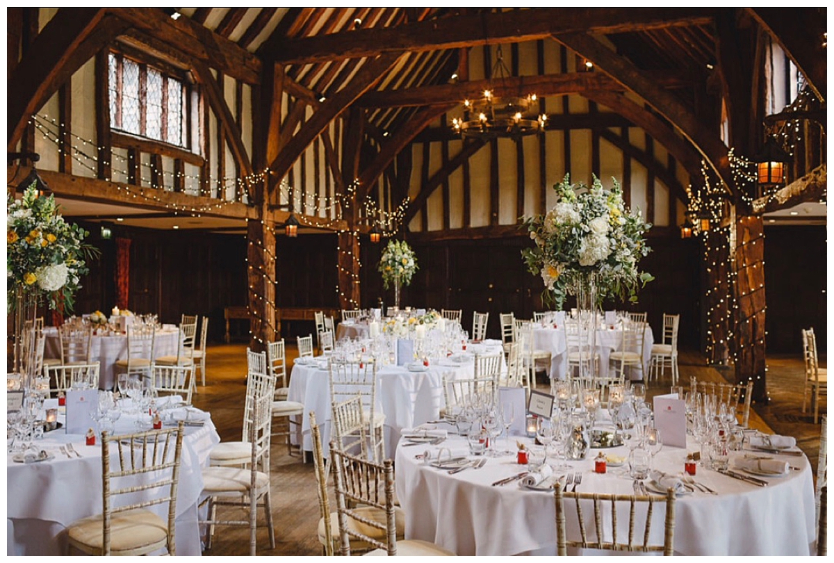 Inside the rustic Tithe Barn for the wedding breakfast, the guests were greeted with a pretty and social layout, with the long oval top table being in the very centre of the Tithe Barn, and the fairy lights strings around the Tudor beams, created a beautiful and enchanting ambiance. The long oval top table featured bouquets in silver vases and vintage silver mercury candlelights, while the surrounding guest tables were adorned with wild and rustic tall vase centrepieces. For the tables around the edges of the barn, where the ceiling is low, candlelit clusters of low vases and pretty silver candleholders created an informal and charming effect.