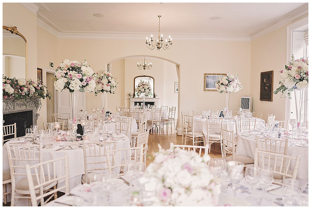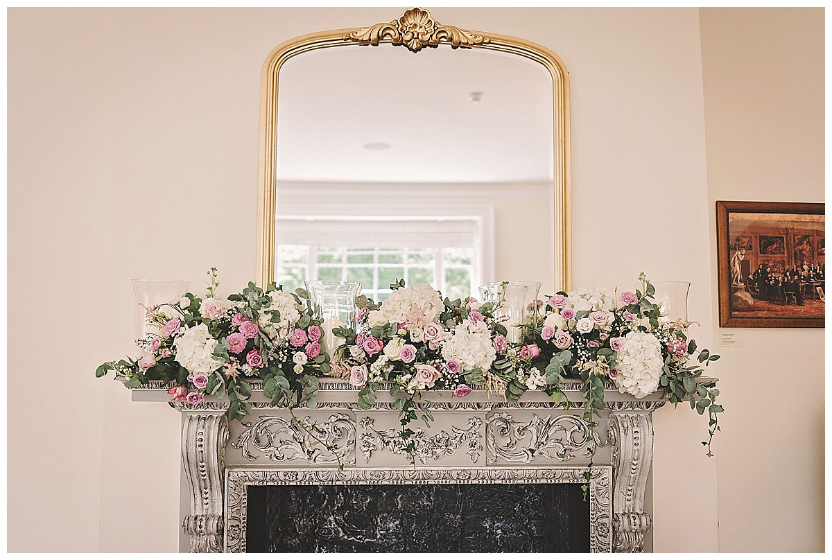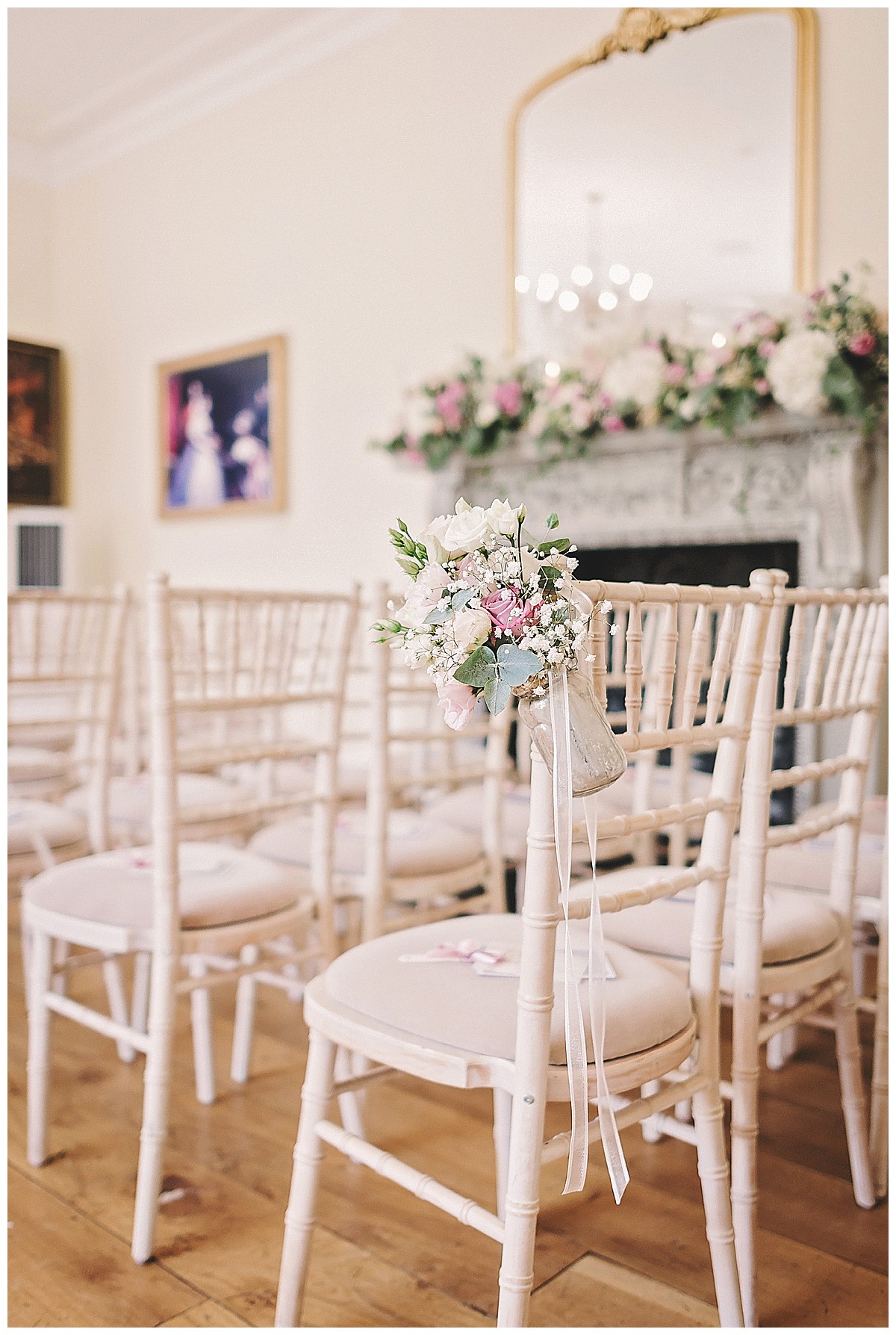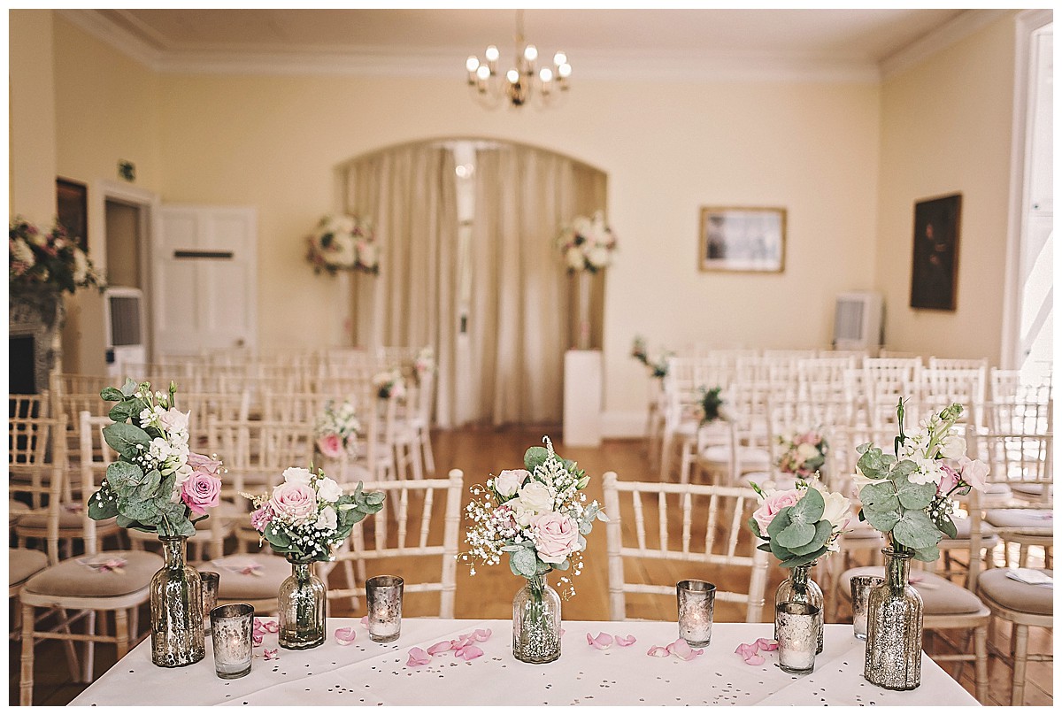 The wedding ceremony and the wedding breakfast were hosted at Pembroke Lodge, in their intimate Russell Suite upstairs. We dressed the room with 4 tall vase centrepieces on plinths and then reused those at table centrepieces on most of the round guest tables – two were used to flank the ceremony area and two more flanking the start of the wedding aisle. Becky really liked our pretty silvery hanging vases for chair posies so we added chair flowers o every other row, and they looked so so sweet. Matching silver bud vases were used to dress the ceremony table and the guest comments book table and we created a gorgeous mantlepiece display with candlelight and blousy blooms. Last but not least we welcomed guests with pretty foliage garlands running up the balustrade, studded with flower clusters every step or so, a really lovely touch which really elevated the decor.