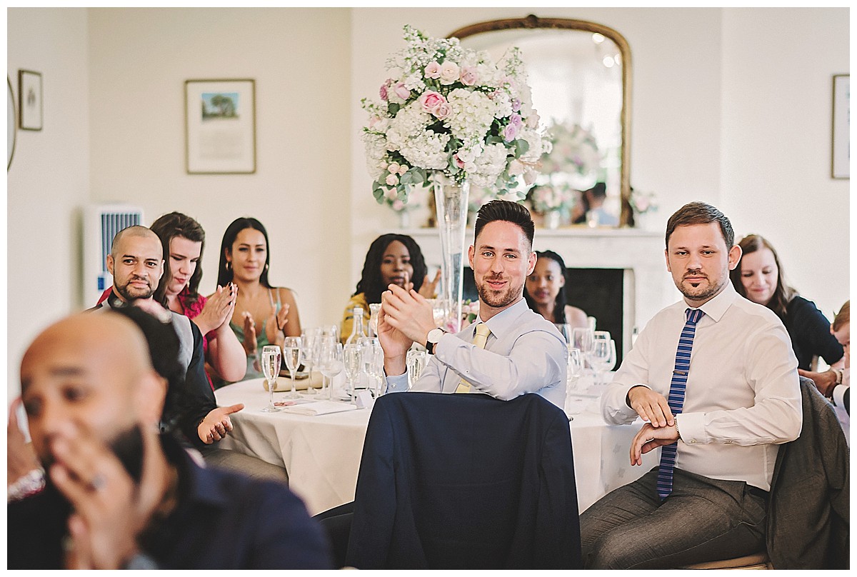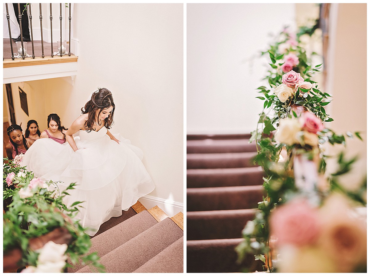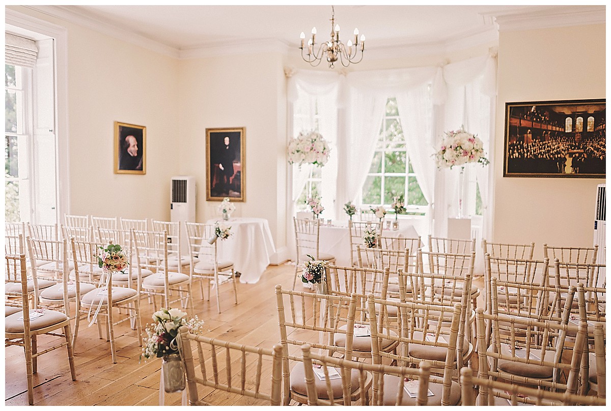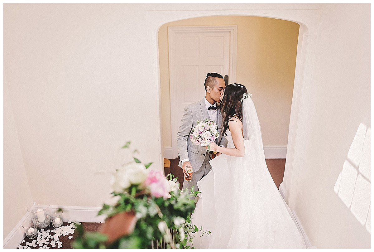 The wedding ceremony and the wedding breakfast were hosted at Pembroke Lodge, in their intimate Russell Suite upstairs. We dressed the room with 4 tall vase centrepieces on plinths and then reused those at table centrepieces on most of the round guest tables – two were used to flank the ceremony area and two more flanking the start of the wedding aisle. Becky really liked our pretty silvery hanging vases for chair posies so we added chair flowers o every other row, and they looked so so sweet. Matching silver bud vases were used to dress the ceremony table and the guest comments book table and we created a gorgeous mantlepiece display with candlelight and blousy blooms. Last but not least we welcomed guests with pretty foliage garlands running up the balustrade, studded with flower clusters every step or so, a really lovely touch which really elevated the decor.