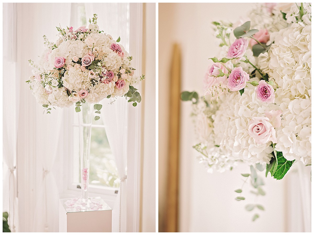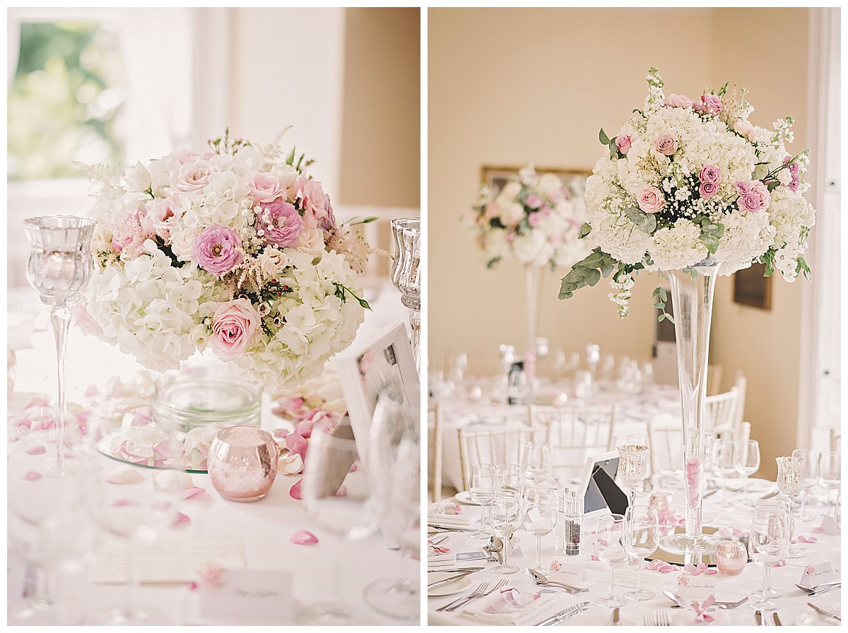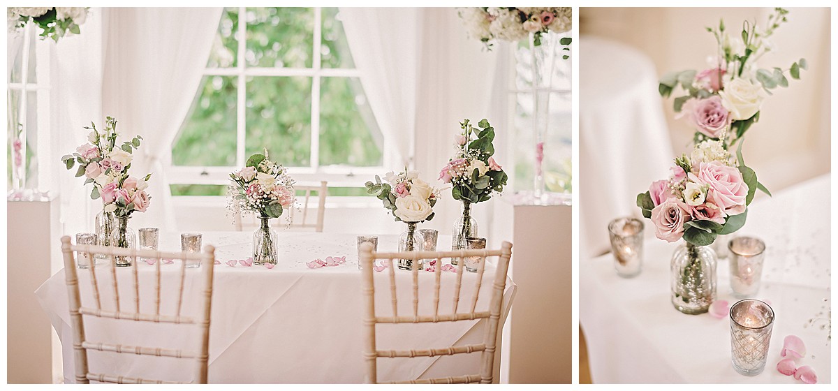 For table centrepieces we used a mix of ivory and dusty pink wedding flowers centrepieces, some on tall vases to add impact as you come into the main part of the room, and some low ones on the back part of the room, through the beautiful arch. Gorgeous candlelight added the finishing touches – I used a mix of tall stemmed champagne silver votives and low dusty pink mercury glass votives – a nice elegant flourish to just nicely finish off the table decor.