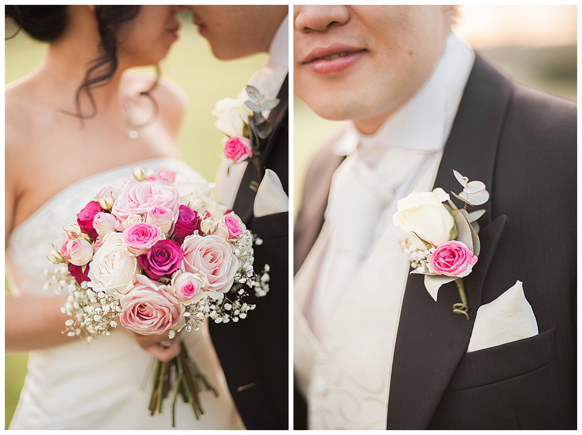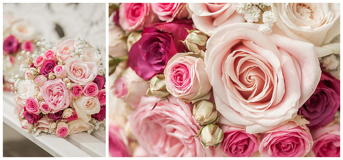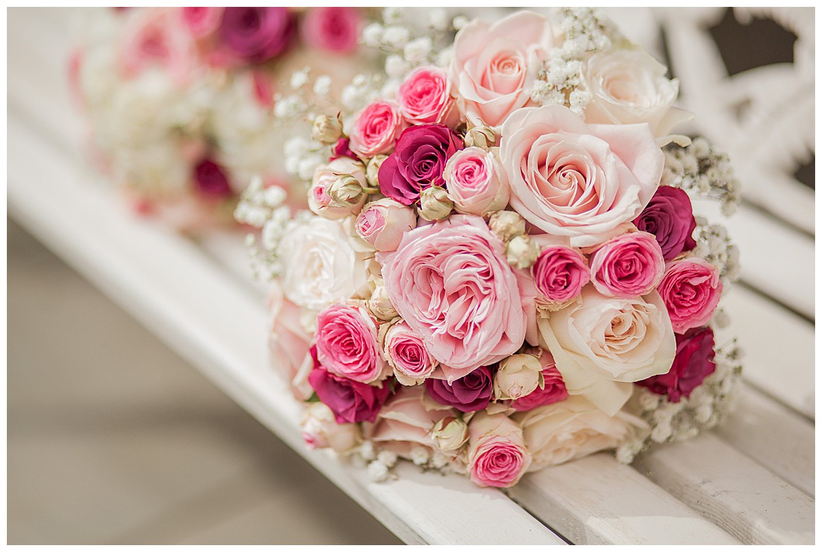 For the this lovely wedding at Coworth Park, we created gorgeous bouquets, with ivory and blush pink roses, and splashes of raspberry coloured roses and halos of dreamy gypsophilla.