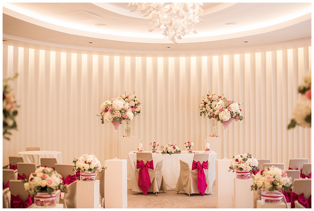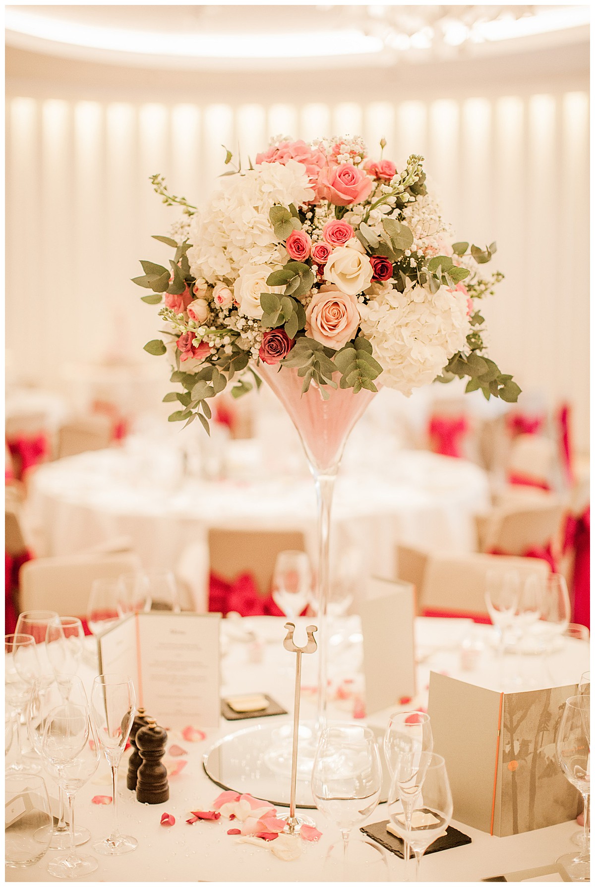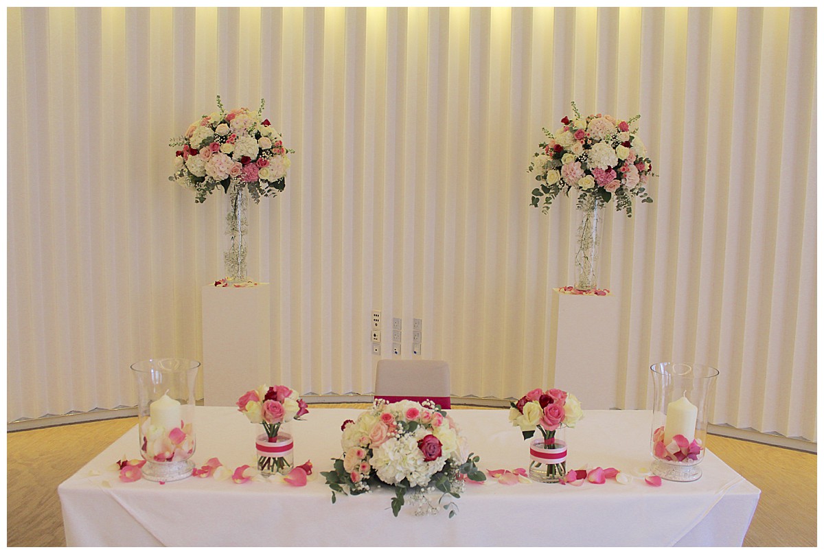 All the wedding flowers for this lovely wedding at Coworth Park worked doubly hard, with a double dose of gorgeousness – they were used once for the ceremony, and then for the evening reception. For the wedding aisle, we made clever use of all the table centrepieces, tall and low ones, by using them on plinth stands to line the aisle. The room came to life with the infusion of pretty pinks. Tall Martini vases started and finished the aisle, and in the middle of the aisle for a lighter effect were the low coordinating vase displays. The aisle was lined with storm vases and rose petal scatter along the floor.