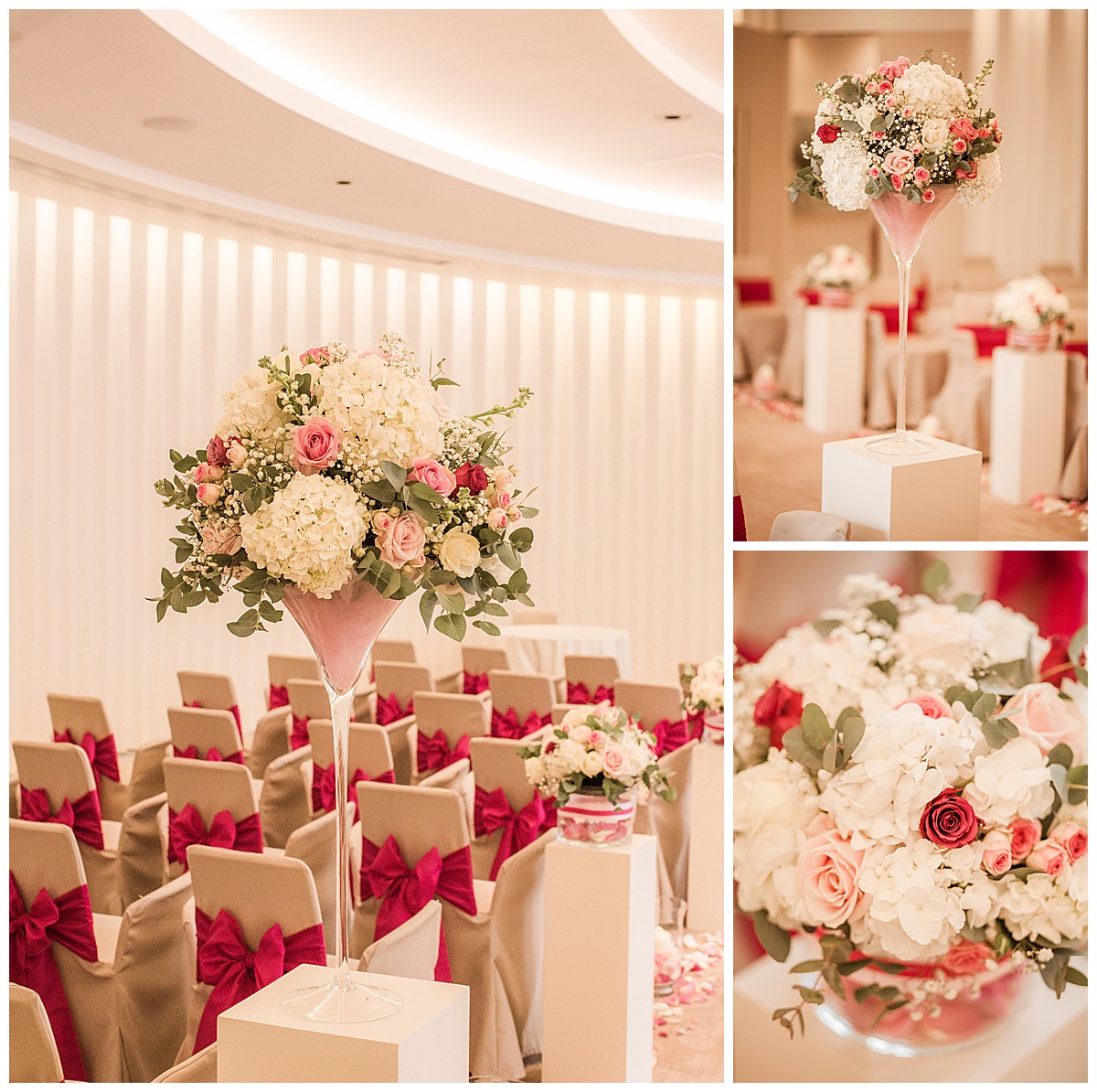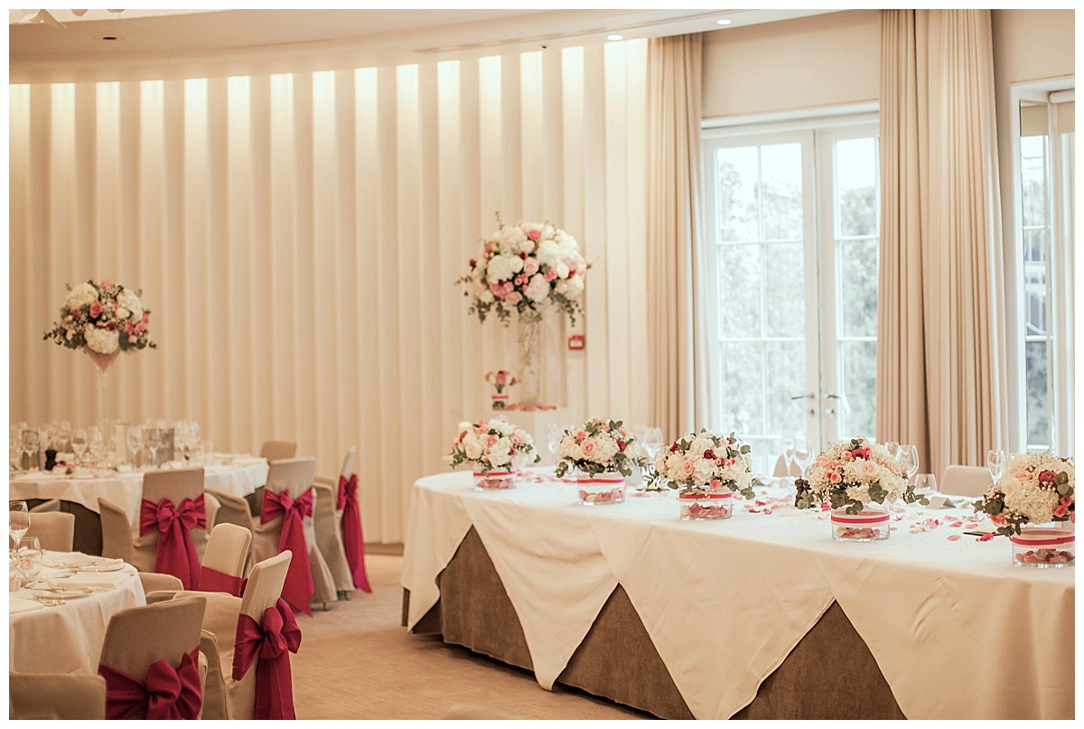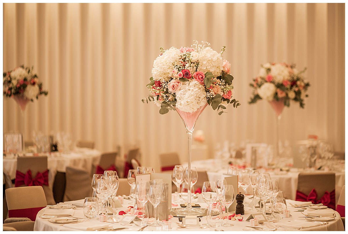 Later on, the tall Martini vase centrepieces were used on the guest tables, and the low vase centrepieces were lined up along the top table. Even the storm vases which were initially lined up on the floor, were later brought back to action. We dotted them around the room, on the plinth stands to add a wonderful candlelit effect later on into the evening.