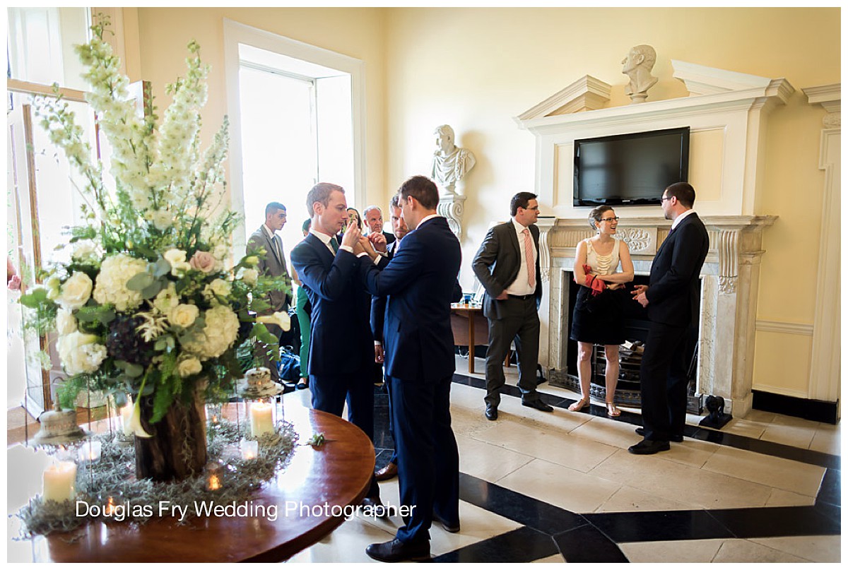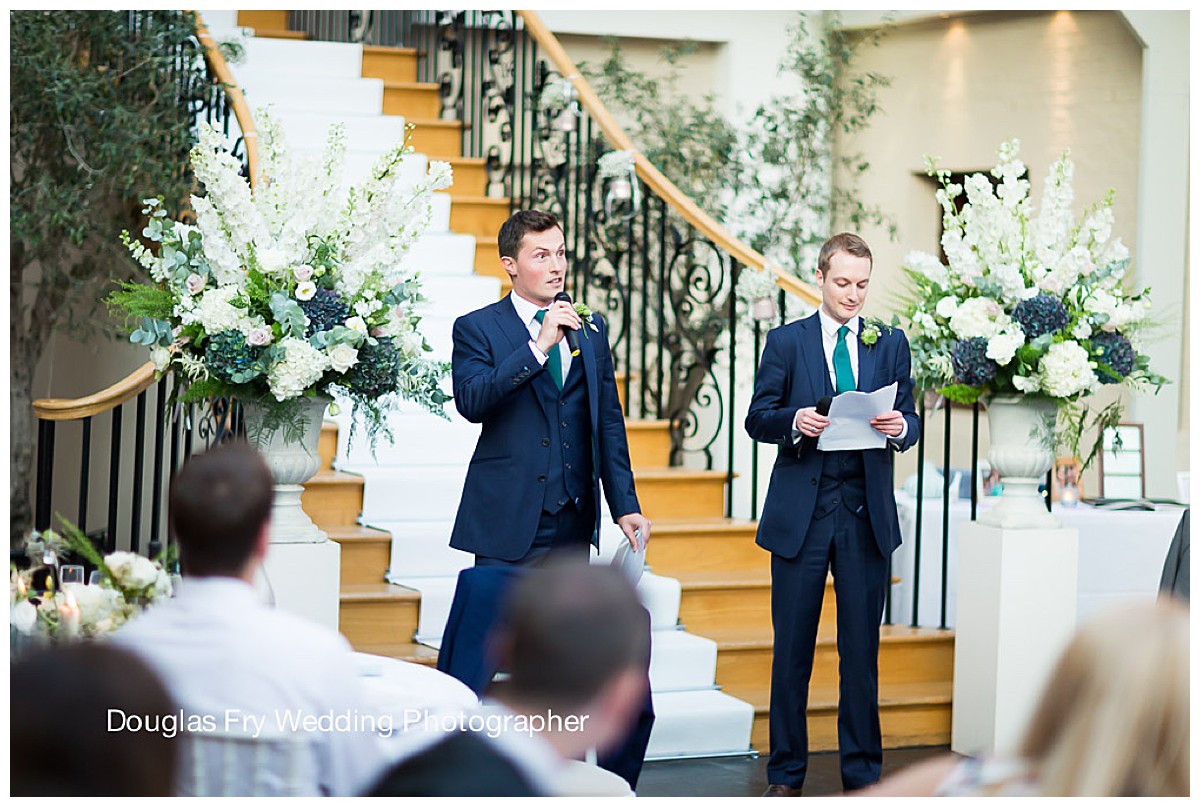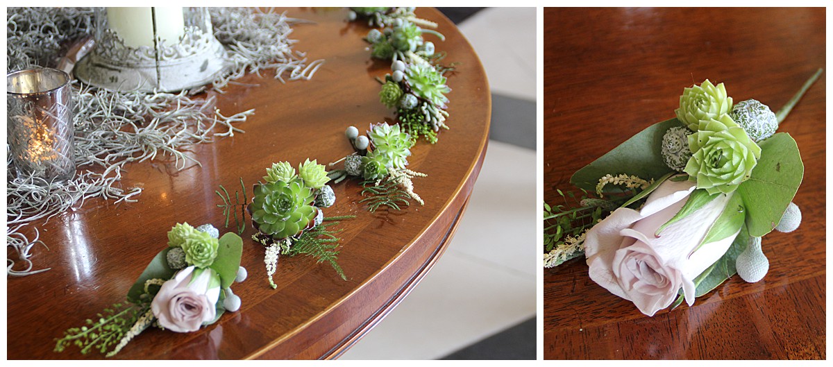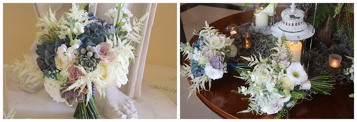 Catherine carried a beautiful textural bouquet, all in ivory, with hydrangeas, astilbe, lisianthus and succulents, while her bridesmaids had matching ones with unusual dark inky blue hydrangeas added in. All men’s buttonholes had interesting mixes of unusual mini succulents and ferns, and George had a Mentha rose and succulents buttonhole to set him apart.