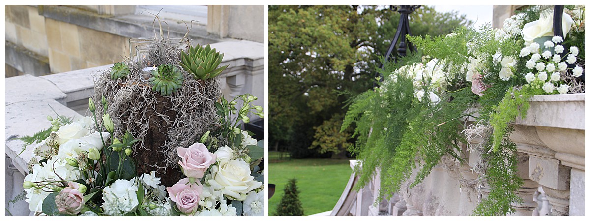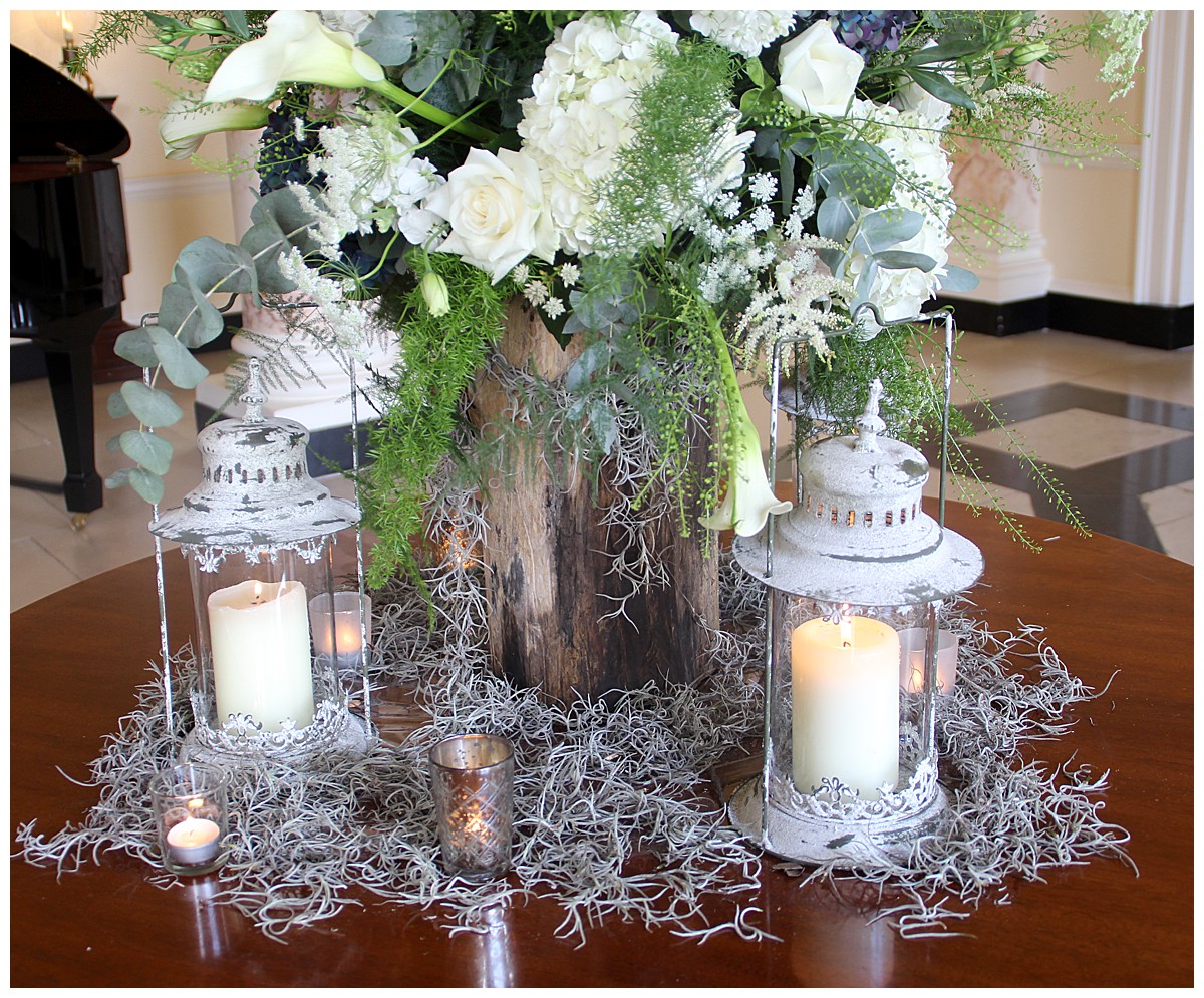 For this whimsical wedding at Botleys Mansion, we welcomed guests with a trailing runner of flowers and ferns along the stair balustrade in front of the main entrance and enchanted forest log displays on the 2 pillars at the top of the outdoor stairs. For the entrance foyer table we created an unusual dramatic display using a rustic log to contrast with the stately surroundings. We surrounded it with shabby chic vintage lanterns, silver reindeer moss and candles.