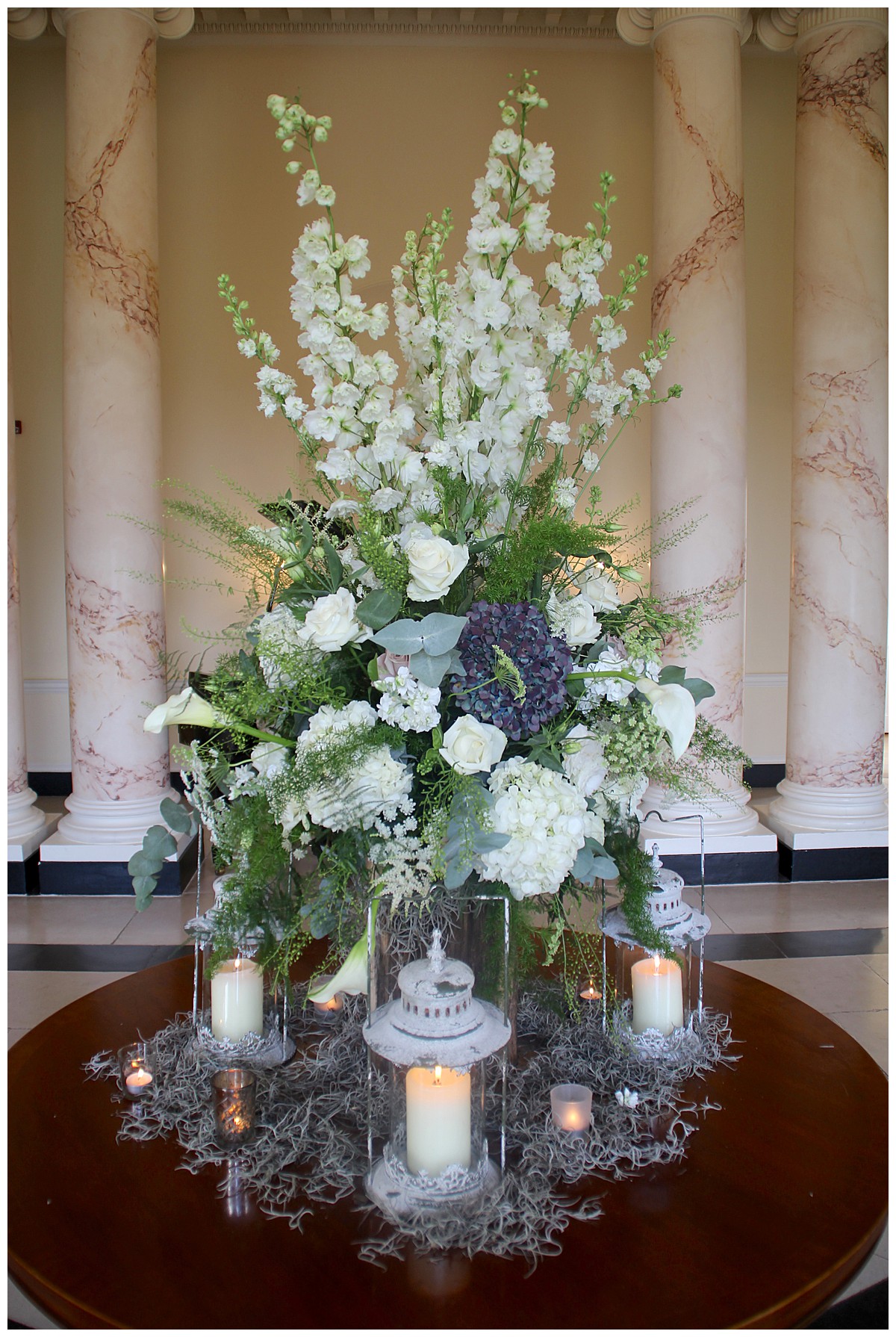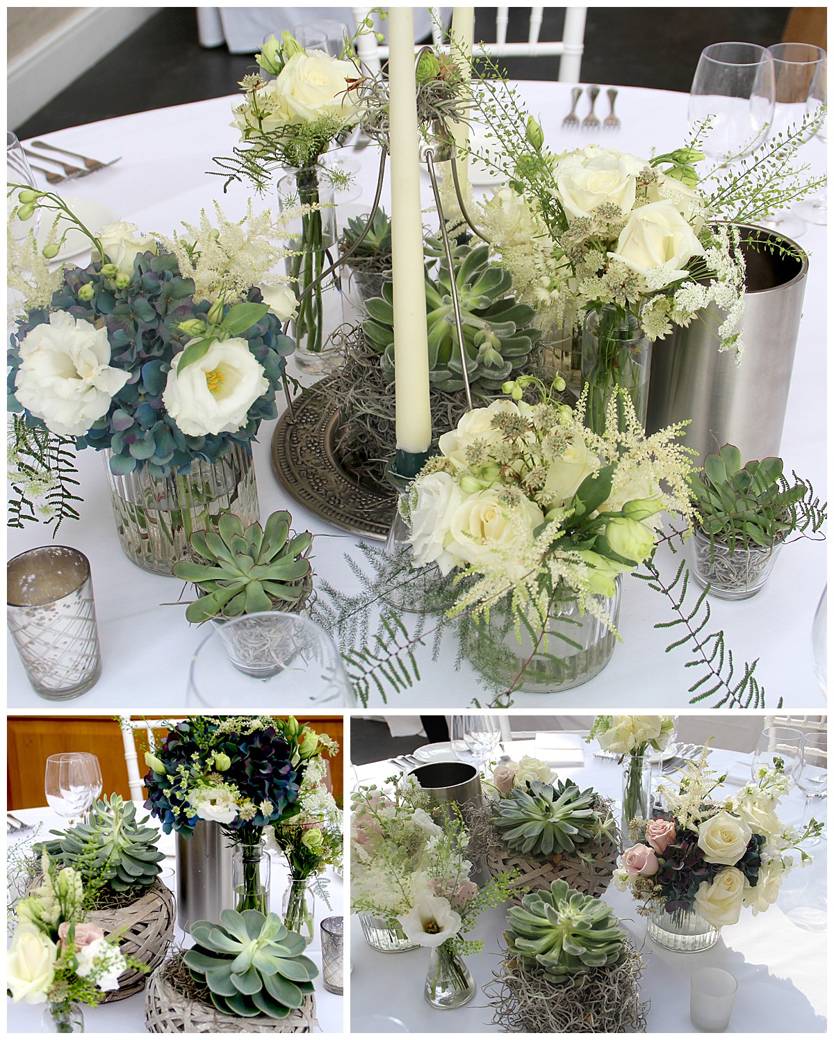 Descending into the atrium, the urns from the Green room were reused to flank the stairs and each table used an eclectic mix of unusual vintage bottles, woven containers, Moroccan metal platters and vintage candle stands, all collected by Catherine, and pretty silver votives. Each table was different and had a slightly different mix of flower displays on them, but all using a common mix of flowers such as ivory and deep inky blue hydrangeas, unusual nude pink Mentha roses, gypsophila, astilbe, scented stocks, thlaspi sprigs, ferns and succulents .