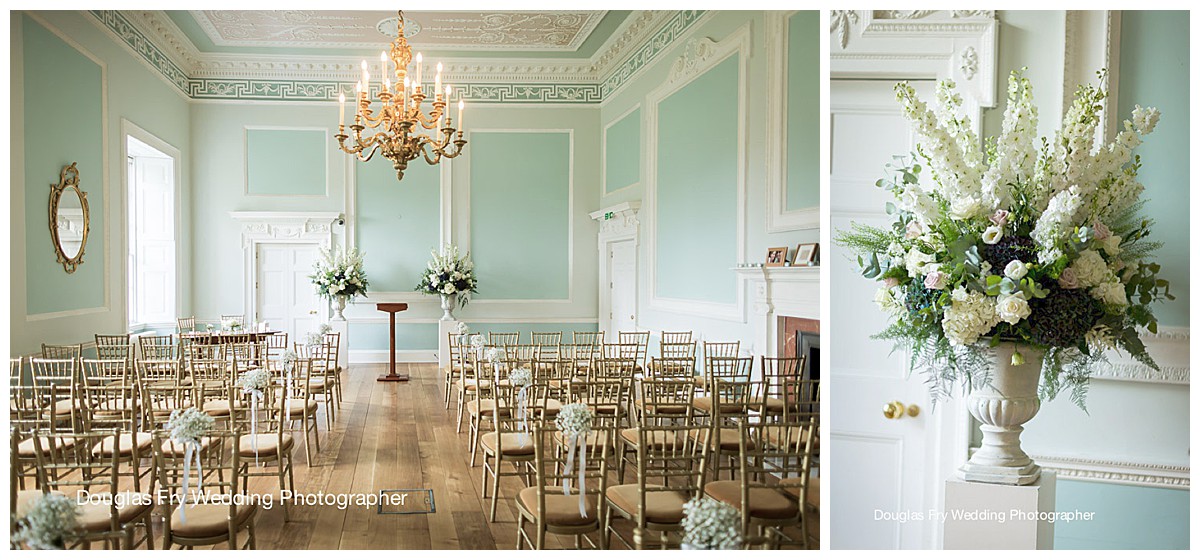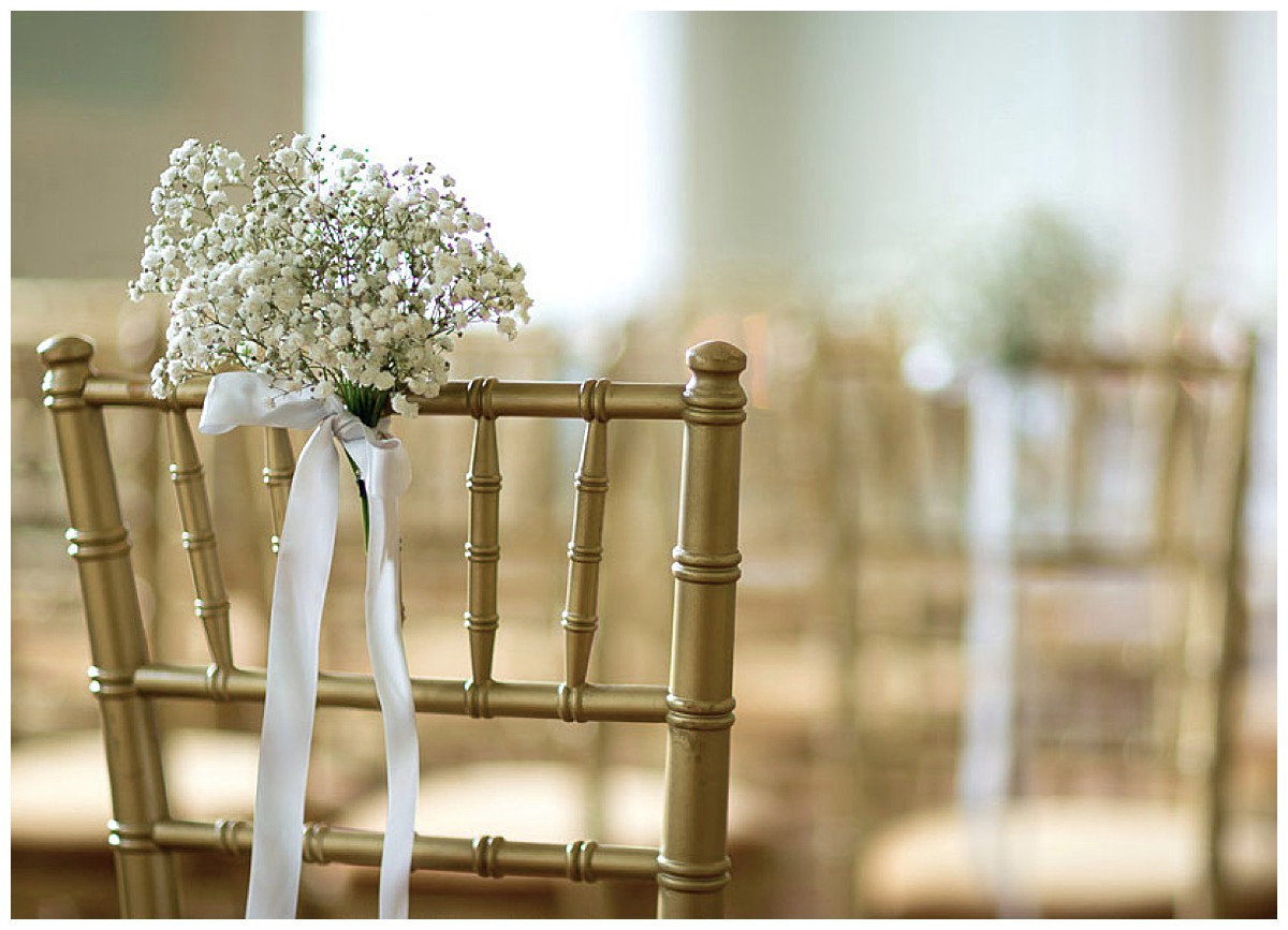 The green room was dressed with two amazing stone urn ceremony displays, overflowing with beautiful hydrangeas, delphiniums, roses, astilbe and ferns, and we dressed the pretty chairs with posies of floaty gypsophila.