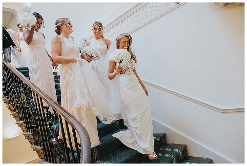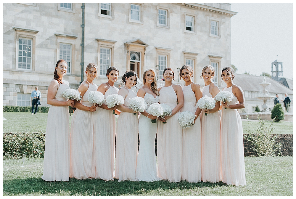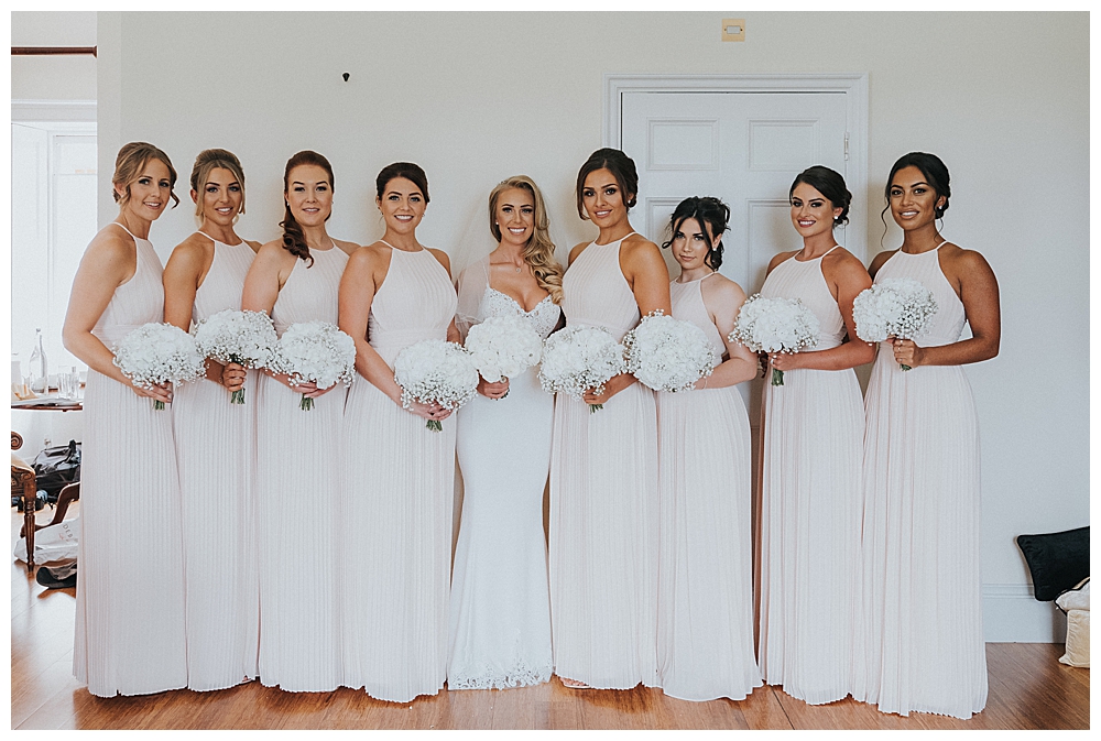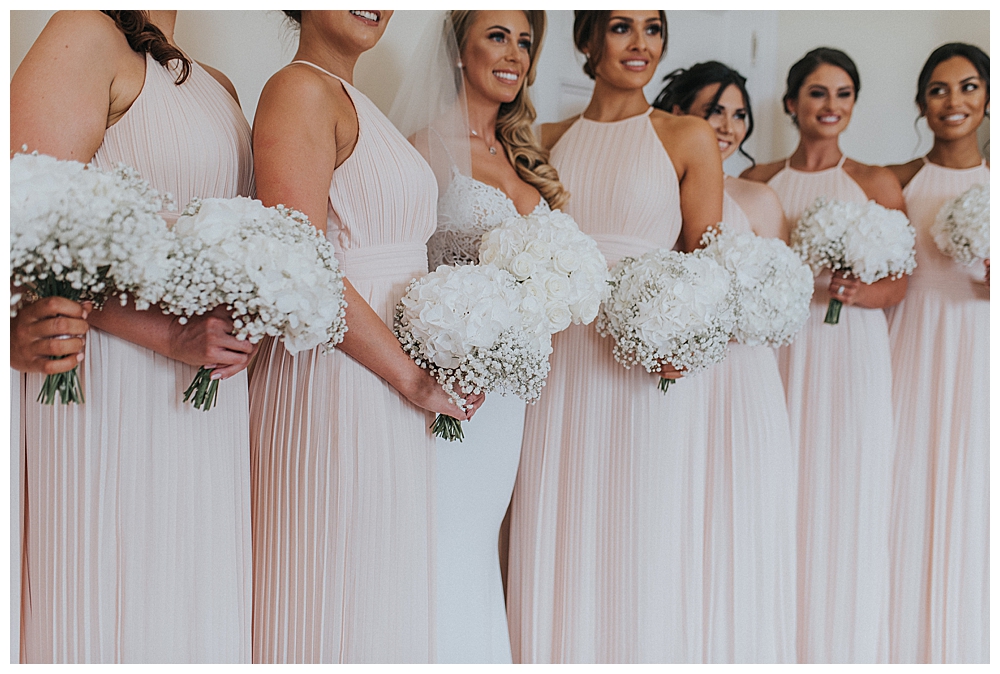 Georgia carried a bouquet of white roses and hydrangeas, keeping it textural to echo the bridal dress which was beautifully fitted and lacy. The bridesmaids, all wearing the most delicate of blush dresses, carried lacy bouquets of hydrangeas and gypsophila.
