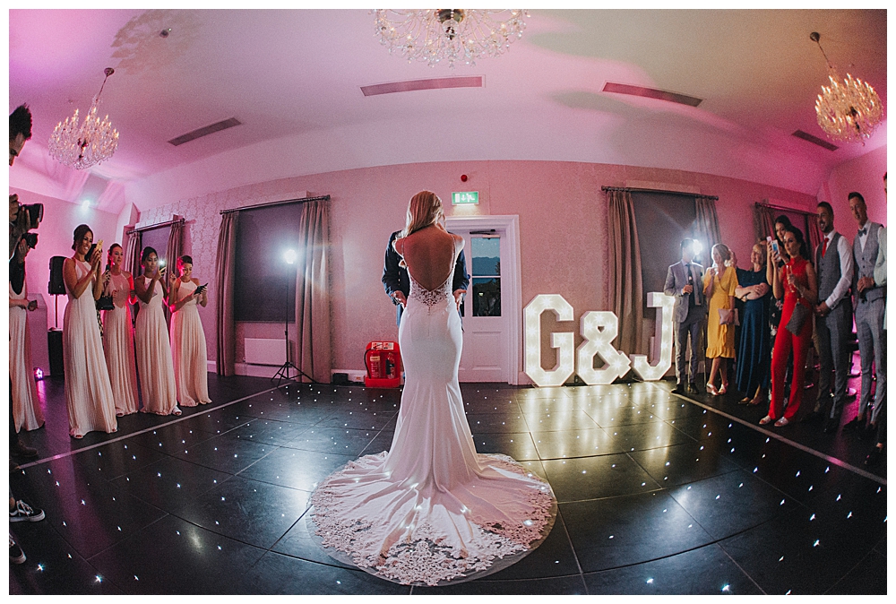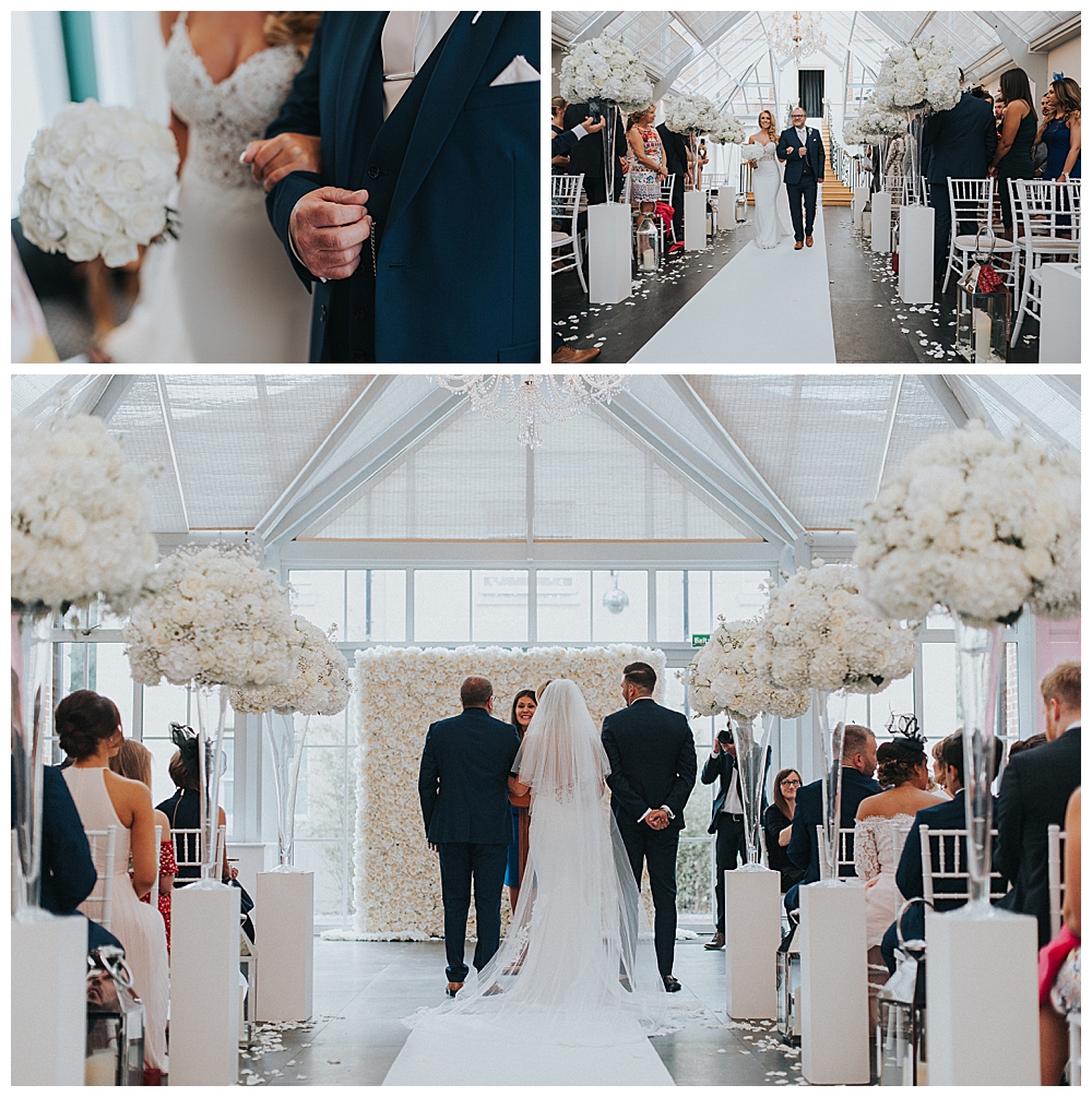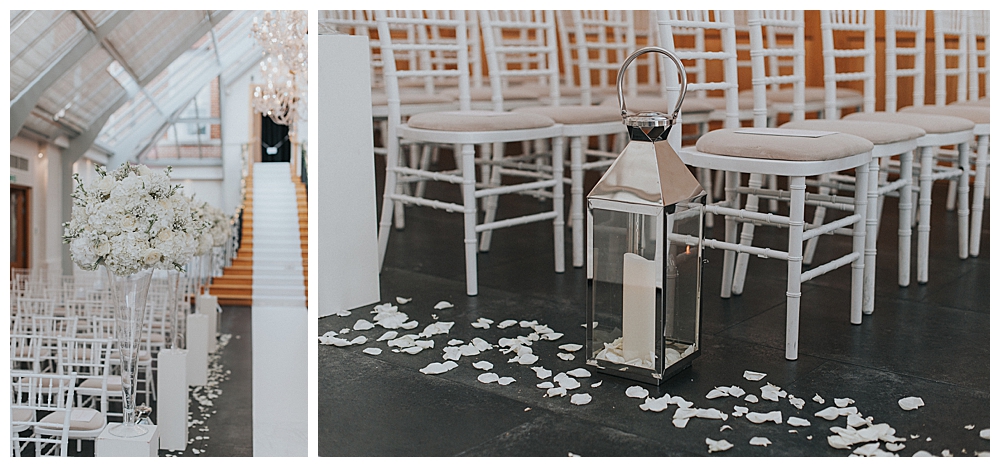 Low down on the floor we added modern lanterns and rose petals scatter. The pièce de la résistance was our beautiful feature flower wall behind the ceremony area, acting as the perfect pure backdrop to the ceremony and later becoming an amazing statement backdrop for the top table.