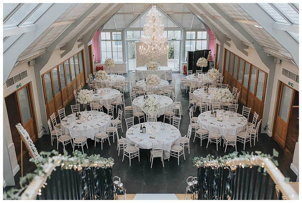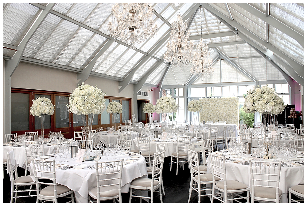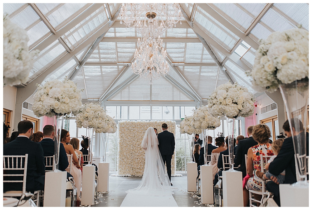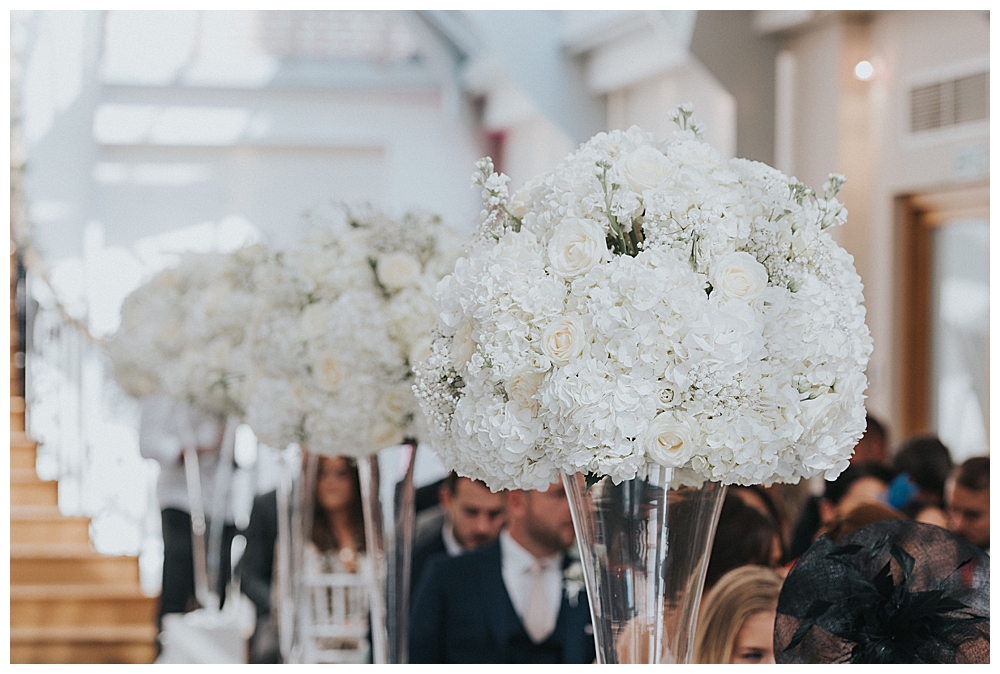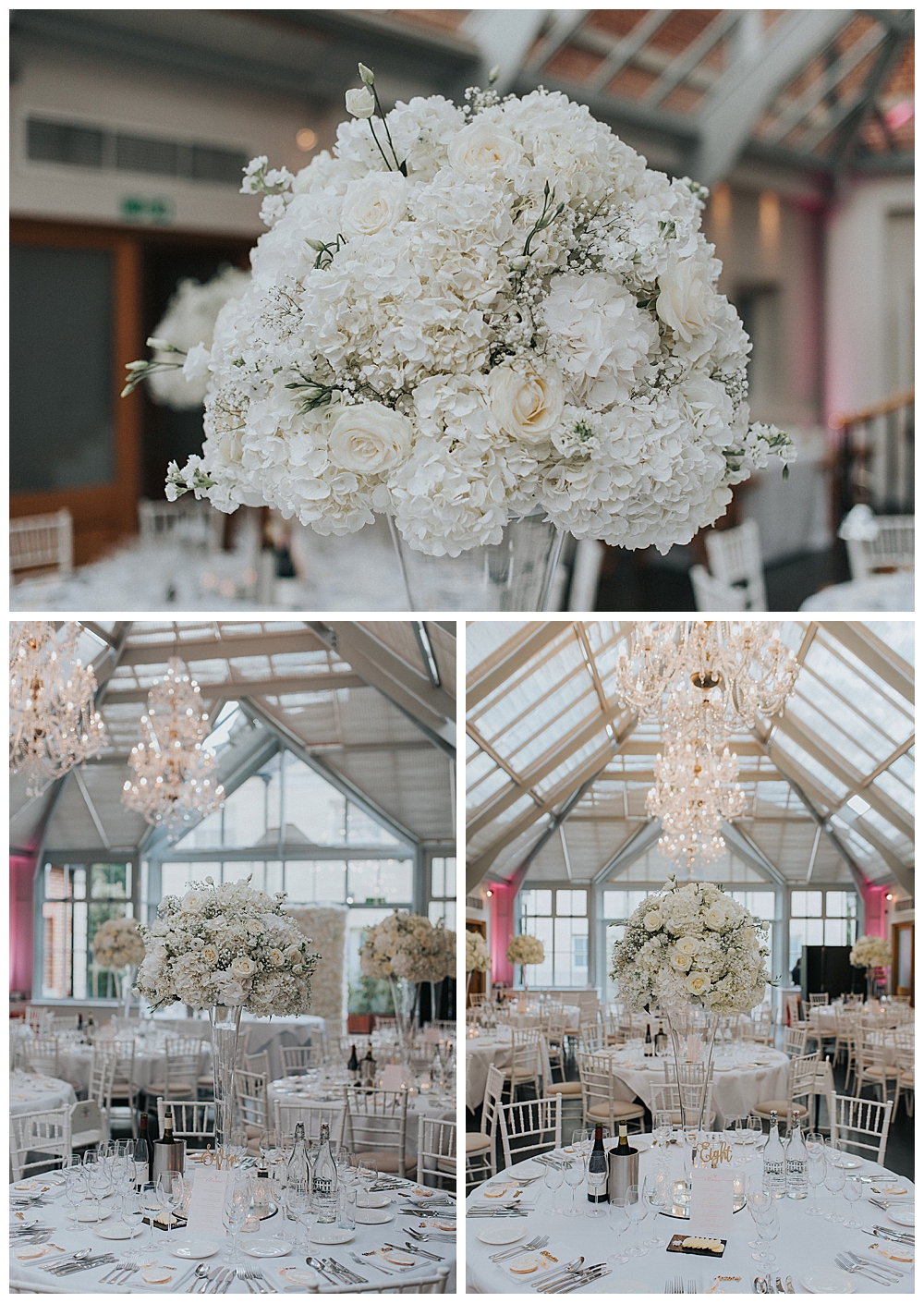 The wedding ceremony was held in the beautiful airy Atrium glasshouse at Botleys Mansion and then the room was turned around for a wedding breakfast. The glasshouse is such a light and airy tall space that we advised Georgia to opt for dramatic tall displays to add a lot of impact high up. The 8 tall table centrepieces were used to amazing effect to first create the most iconic looking wedding aisle, with pairs of tall white floral vase centrepieces lining up the entire wedding aisle. Since this beautiful wedding white wedding at Botleys Mansion got a little bit of press, it has created somewhat of a trend for floral styling of the wedding aisle at Botleys. I’m often asked to recreate this gorgeous inspirational look and I’m not really surprised as it really was so magical…