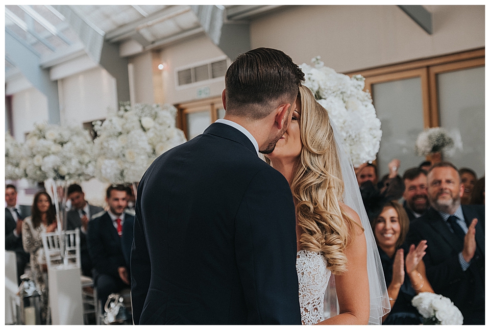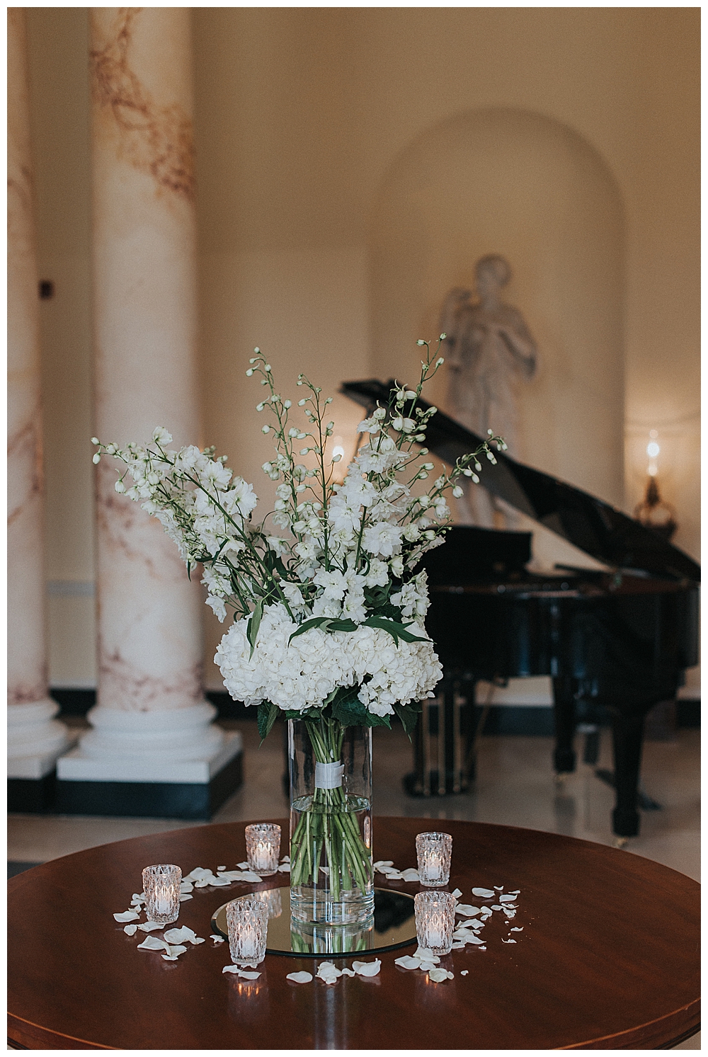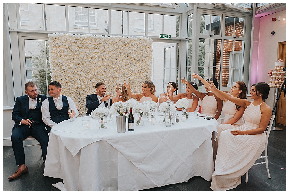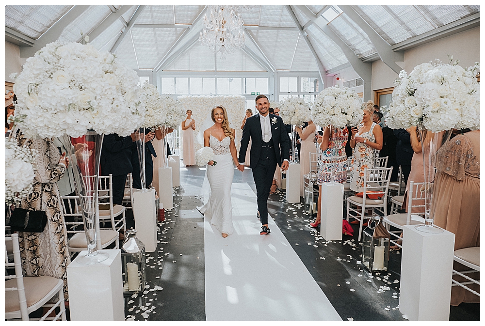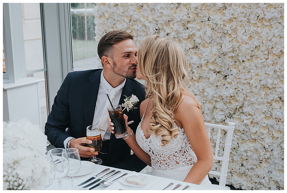 The wedding ceremony was held in the beautiful airy Atrium glasshouse at Botleys Mansion and then the room was turned around for a wedding breakfast. The glasshouse is such a light and airy tall space that we advised Georgia to opt for dramatic tall displays to add a lot of impact high up. The 8 tall table centrepieces were used to amazing effect to first create the most iconic looking wedding aisle, with pairs of tall white floral vase centrepieces lining up the entire wedding aisle. Since this beautiful wedding white wedding at Botleys Mansion got a little bit of press, it has created somewhat of a trend for floral styling of the wedding aisle at Botleys. I’m often asked to recreate this gorgeous inspirational look and I’m not really surprised as it really was so magical…