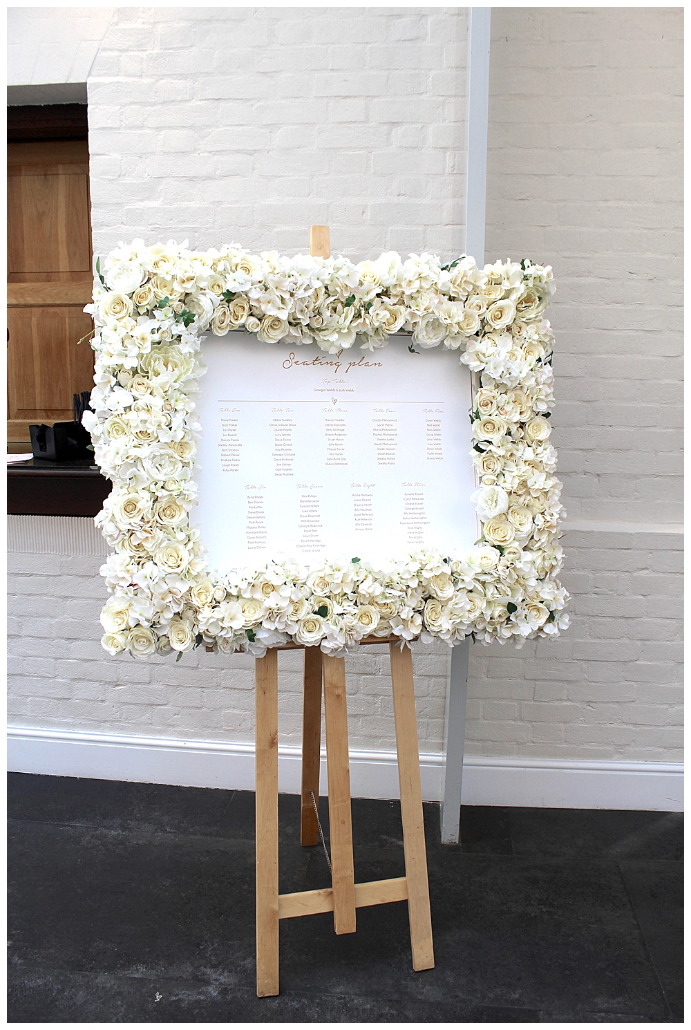 Finishing touches were in abundance throughout with lots of candle lit votives on the tables, pretty favours and name tags, and our beautiful floral seating plan frame. The whole look for this white wedding at Botleys Mansion was pure elegance and attention to detail from the big things to the little things.
